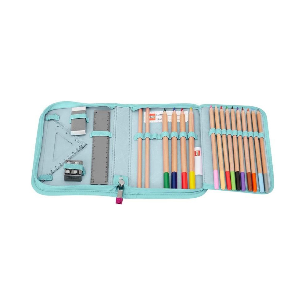 A LEGO motívummal ellátott tok minden szükséges iskolai írószert tartalmaz. A tok a következő töltelékkel érkezik: 2 grafitceruza, 10 színes zsírkréta, 4 széles színes zsírkréta, radír, hegyező, egyenes és háromszög alakú vonalzó. A tok átlátszó zsebben egy órarendet és egy bevarrt névtáblát tartalmaz. Tartós anyagból készült, PVC nélkül. Ideális az általános iskola első osztályába.