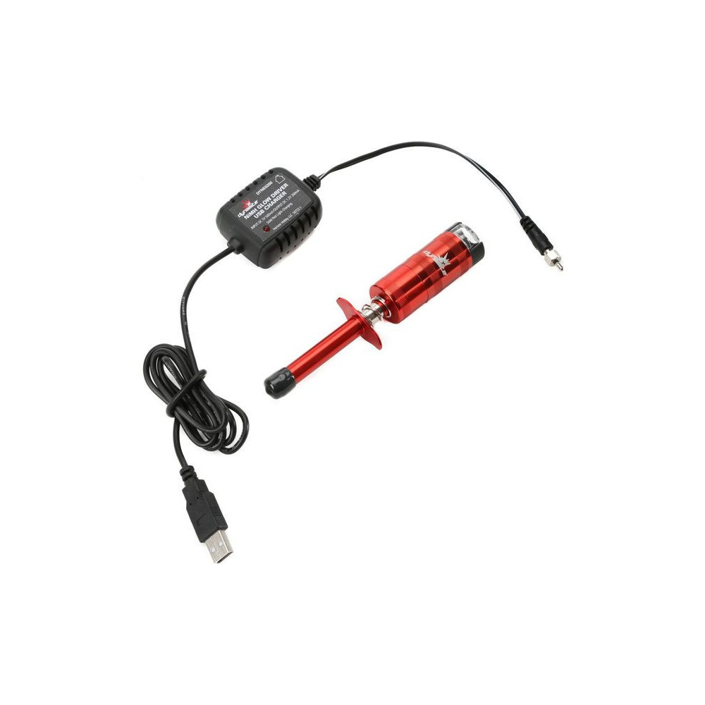 Izzító dugó integrált NiMH akkumulátorral és mérővel RC modell izzítómotorok indításához, USB töltővel együtt. Az USB töltő nem rendelkezik töltésvégződéssel, és 8 óra után ki kell kapcsolni (a használt USB tápegységtől függően, lásd a kézikönyvet).