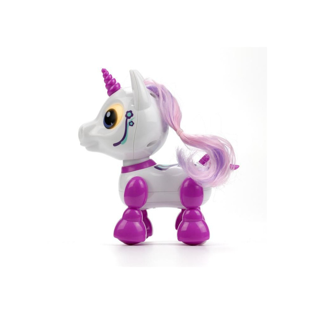 Interaktív robot egyszarvú, amely jár, mozgatja a fejét, LED-szemei vannak és hangokat ad ki.