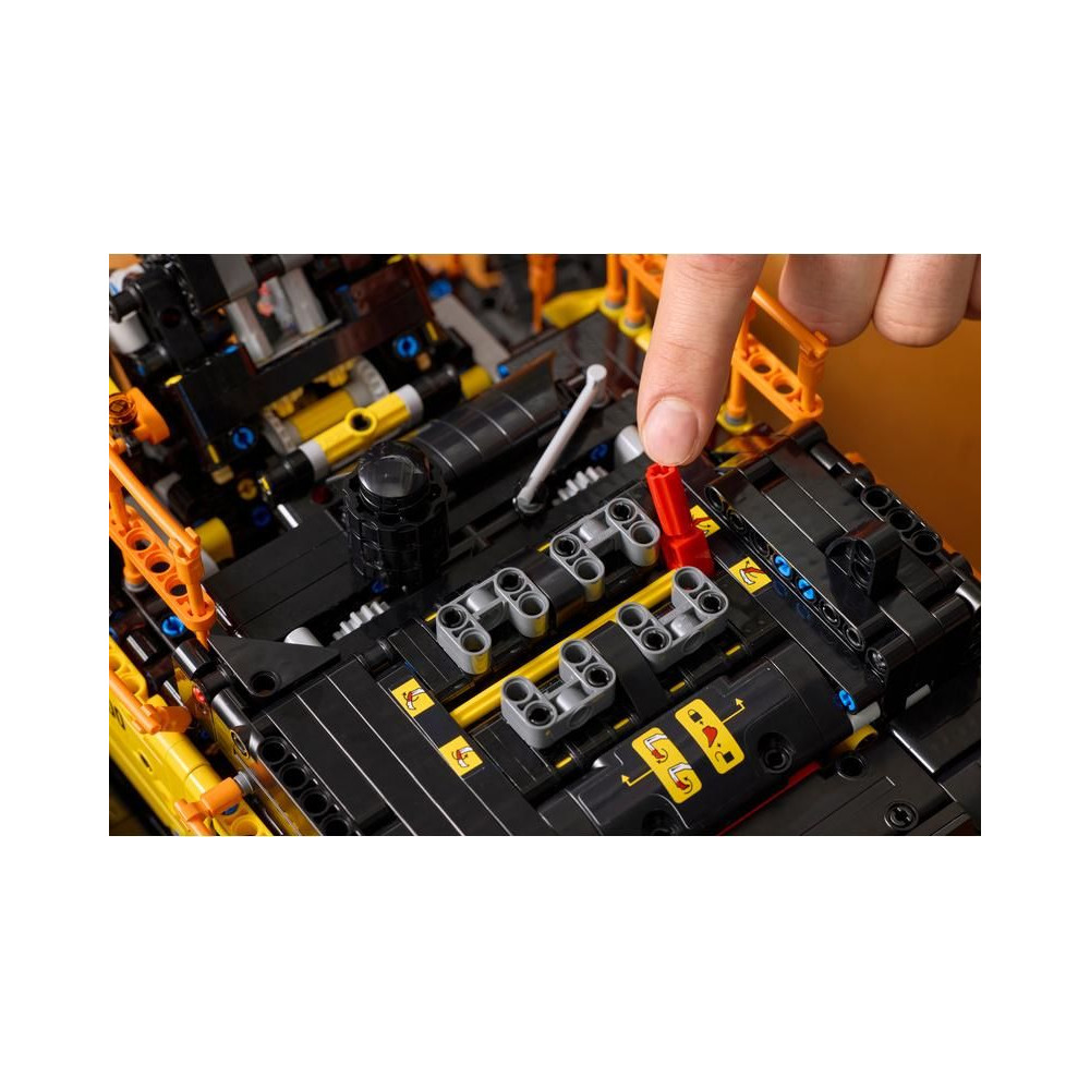 Merülj el egy építési projektben a LEGO® Technic (42215) Volvo EC500 hibrid kotrógép felnőtteknek szánt készletével. Az építés csak a kezdet, mivel ez a motoros modell tele van funkciókkal. Teszteld a kotrógépet a motorral és a sebességváltóval, és fedezd fel a funkcióit. A kar segítségével 4 funkció közül választhatsz, amelyek a kotrógép gémjét és karját, valamint a LEGO kalapácsot és lapátot mozgatják. A manuális funkciók közé tartozik a fülkeajtók nyitása, a lánctalpak mozgatása és a kotrógép felépítményének forgatása.
