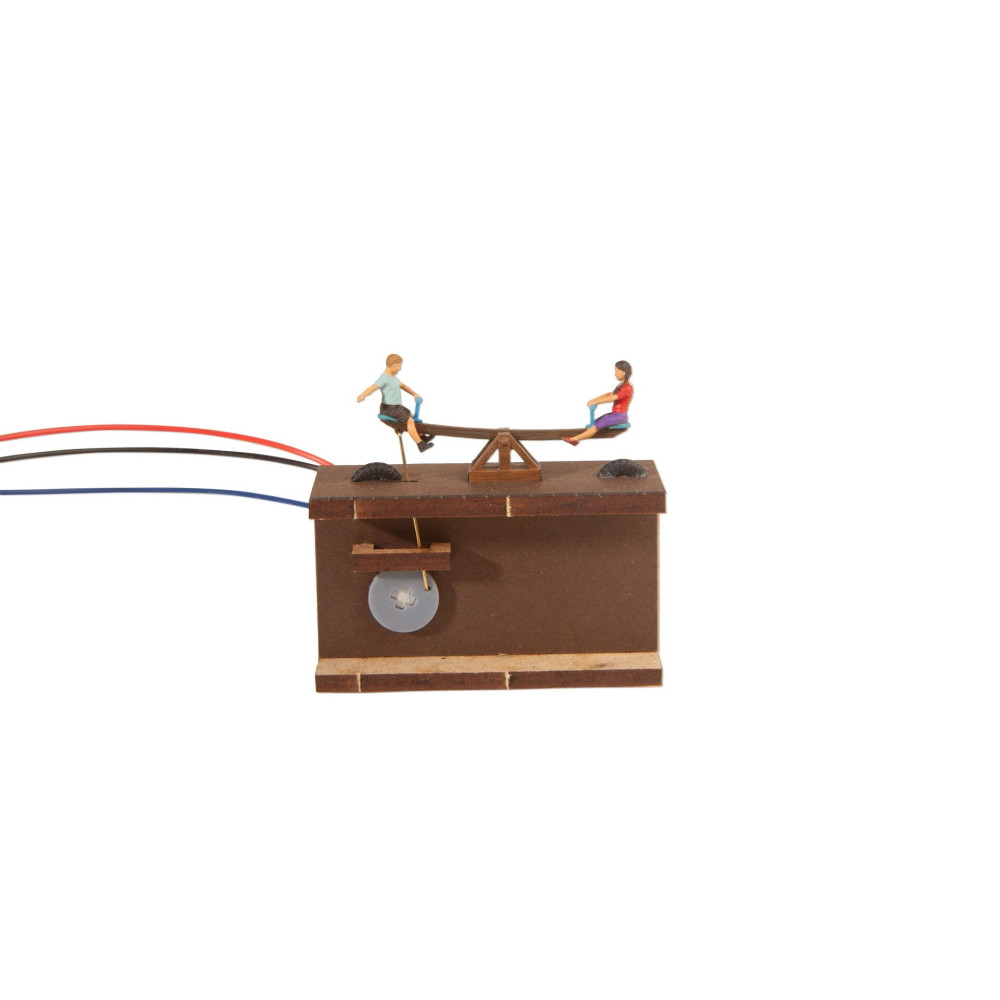 Takmer každý z nás má pravdepodobne pekné spomienky na detské ihriská a jednotlivé zariadenia detských ihrísk. Hojdačka, na ktorej sa na nás rodičia celé hodiny pozerali; detský kolotoč, na ktorom sa nám vždy točila hlava, alebo hojdačka, na ktorej bolo tak ťažké udržať rovnováhu. Detské ihriská sa nachádzajú v každom meste a dedine, a preto sú dôležitou súčasťou ľudského spolužitia. Stretávajú sa tu rodiny, deti sa hrajú a smejú, rodičia sa rozprávajú o práci a vzdelávaní a nejeden človek si vymieňa najnovšie klebety, zatiaľ čo sa jeho potomok pokojne hojdá. Po minuloročnom veľkom úspechu "stromu s hojdačkou" sme sa pustili do vývoja štyroch kusov pohyblivých zariadení detského ihriska: detskej hojdačky, klasickej hojdačky, hojdačky vtáčie hniezdo a detského kolotoča. Ručne maľované zariadenia detského ihriska a modely figúrok sú kompletne zostavené. Každé zariadenie je poháňané motorom umiestneným priamo pod modelom (montážna hĺbka 35 mm). Mechanika na pohon sa dodáva ako stavebnica. Dodávaná elektronika sa pripája na štandardný 16 V modelársky železničný transformátor a je vhodná na jednosmerný aj striedavý prúd. Otáčky hračky sa dajú nastaviť na doske plošných spojov.