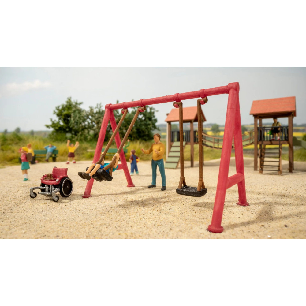 Ručne maľované vybavenie detského ihriska a modely figúrok sa dodávajú kompletne zostavené. Každé zariadenie je poháňané motorom, ktorý je umiestnený priamo pod modelom (montážna hĺbka 35 mm). Mechanizmus na pohon sa dodáva ako stavebnica. Dodávaná elektronika sa dá pripojiť k štandardnému 16 V transformátoru modelovej železnice a je vhodná na striedavý aj jednosmerný prúd. Rýchlosť zariadenia detského ihriska sa dá nastaviť na doske plošných spojov.