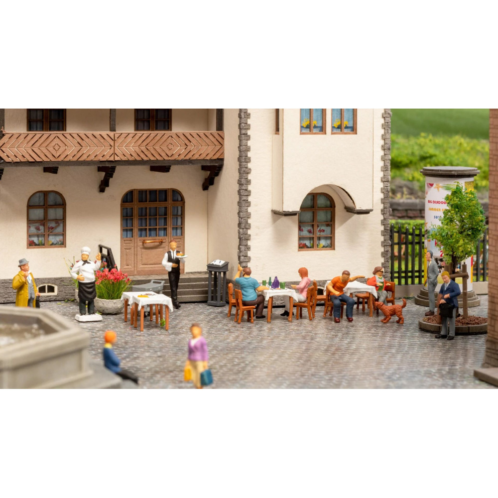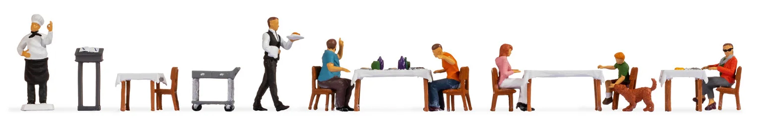 5 sediacich zákazníkov a 1 pes, 1 čašník, 1 veľký reklamný maskot "šéfkuchára", 4 stoly, 6 stoličiek, 1 servírovací vozík, 1 stojan s jedálnym lístkom