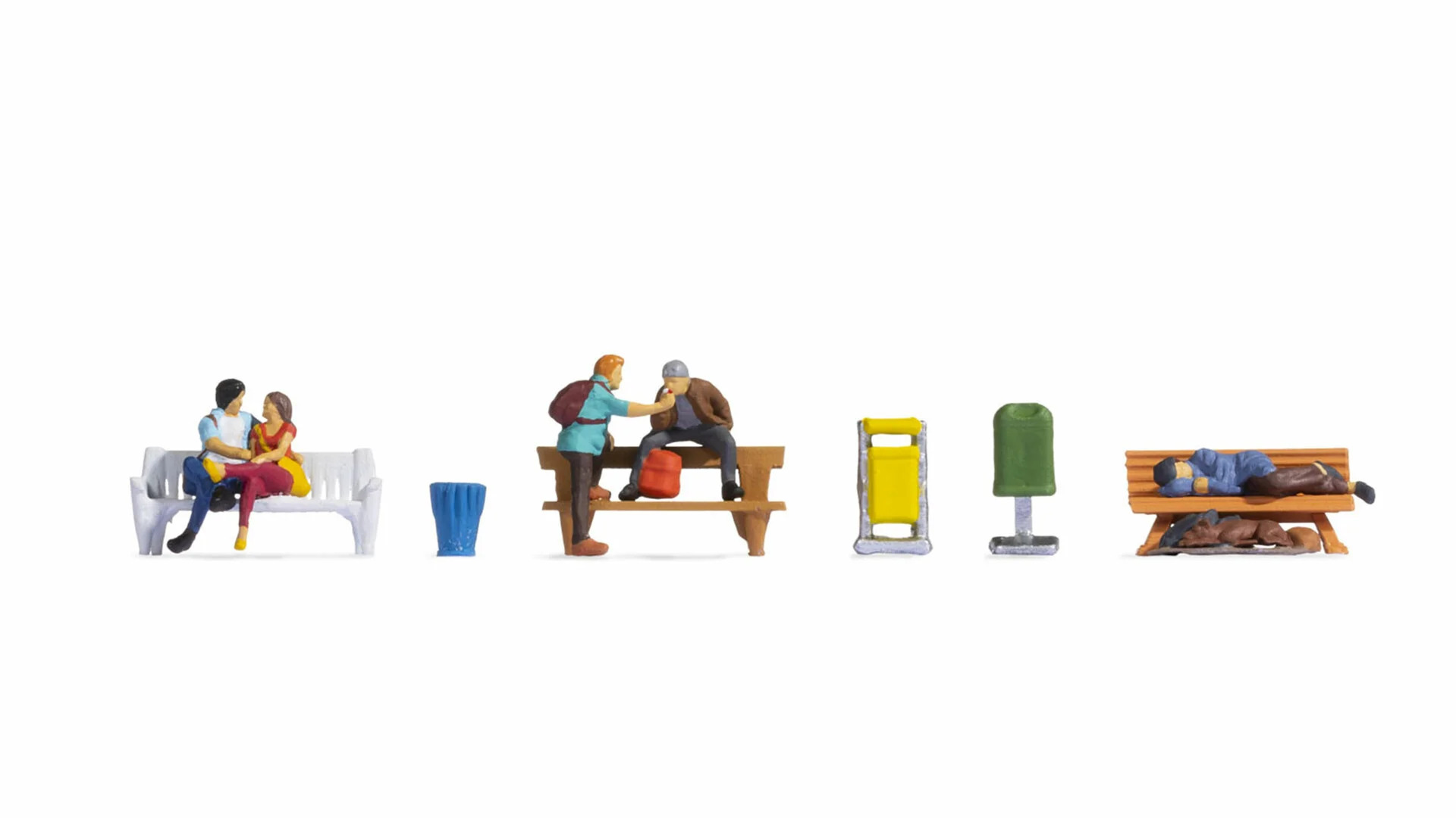Na jednej lavičke spolu sedí pár, zatiaľ čo dvaja mladí muži sa rozprávajú neďaleko. Kým muž s klobúkom sedí na operadle lavičky s batohom pred sebou, druhý si opiera nohu o lavičku a má na sebe batoh. Súčasťou je aj bezdomovec spiaci na lavičke. Všetky jeho svetské veci sú na deke pod lavičkou. Miesto si tu našiel aj jeho pes. Žiaľ, aj dnes je množstvo ľudí postihnutých bezdomovectvom a z tohto dôvodu musia žiť na ulici. Vďaka modelovým figúrkam od NOCH môžete teraz tento aspekt reality stvárniť v modeli a zobraziť všetky aspekty reality na svojom makete.