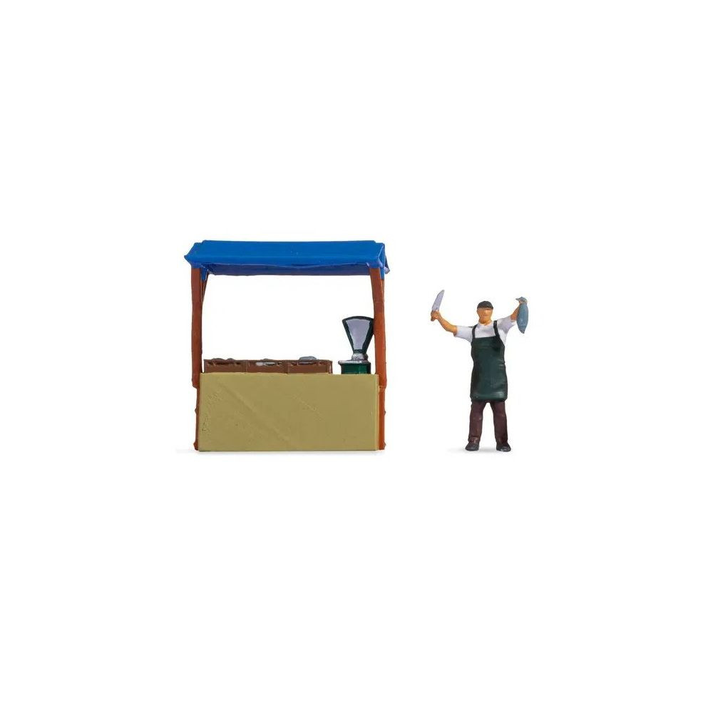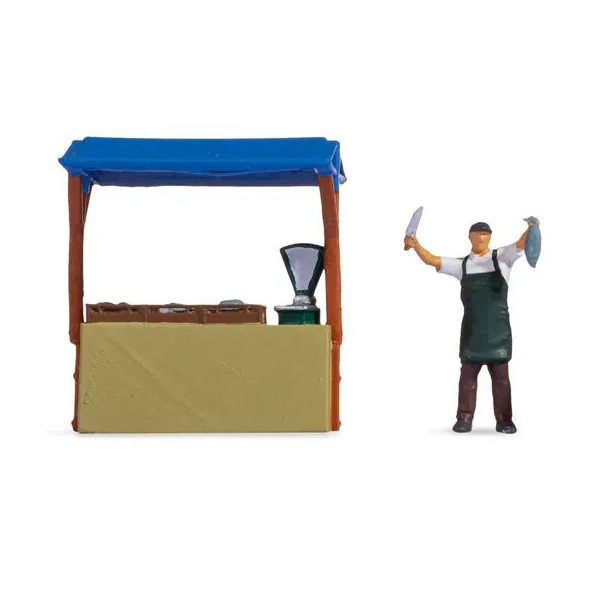 A Tiny-Scenes segítségével valósághű heti piacot hozhatsz létre egy tájképi modell alapján. Ez a jelenet egy halas standot és egy árust ábrázol. A barna bódé kék teteje védi a ládákba helyezett halakat. Az eladó fehér pólót, sötét nadrágot és kék kötényt visel. Az egyik kezében egy halat, a másikban egy kést tart. Hogy felhívja a figyelmet az állására, mindkét karját felfelé nyújtja.