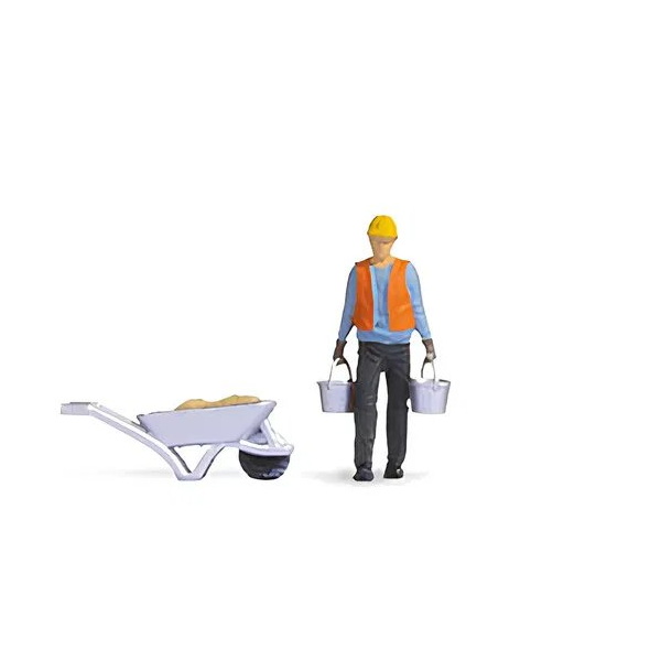 Ebben a jelenetben egy narancssárga mellényt és sárga építőipari sisakot viselő férfi munkás látható. Két vödröt visz. Tartalmaz egy hozzá illő talicska is, tele építőanyagokkal.