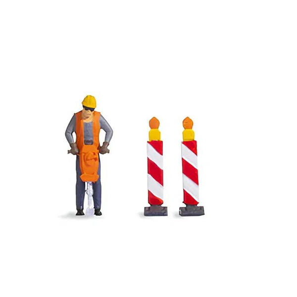 Ebben a jelenetben egy narancssárga mellényt és sárga építőipari sisakot viselő férfi munkás látható. Mindkét kezével kalapácsot tart a kezében. A csomagban megtalálhatók a hozzá illő útkorlátok a tipikus fehér és piros színekben.