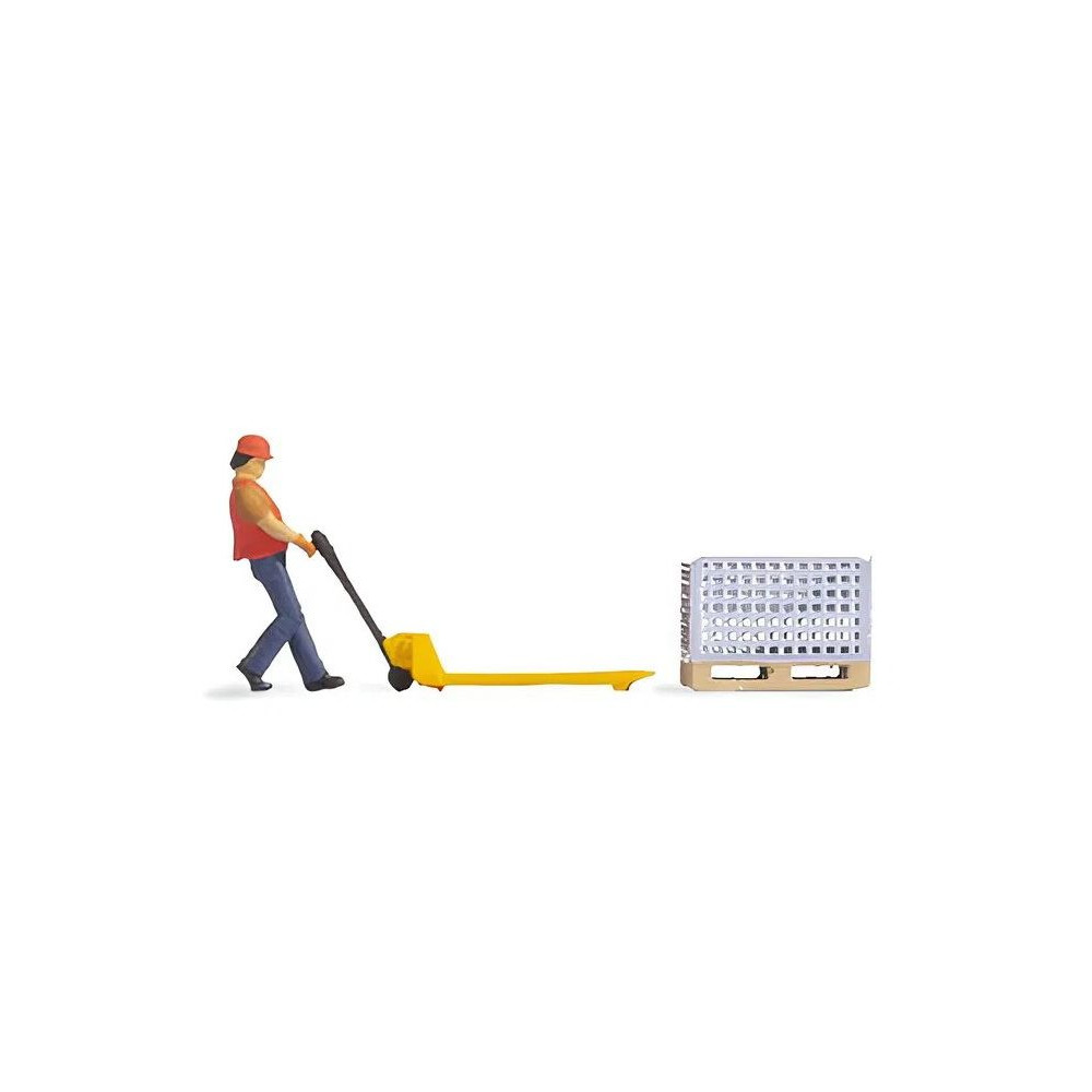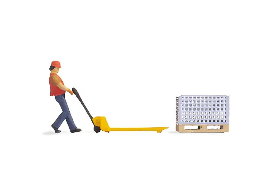 Ebben a jelenetben egy férfi raktári munkás egy raklapemelőt vezet. Narancssárga mellényt, narancssárga sapkát és sötétkék munkásnadrágot visel. A készlet tartalmaz egy hozzá illő Euro raklapot is fém hálós dobozzal.