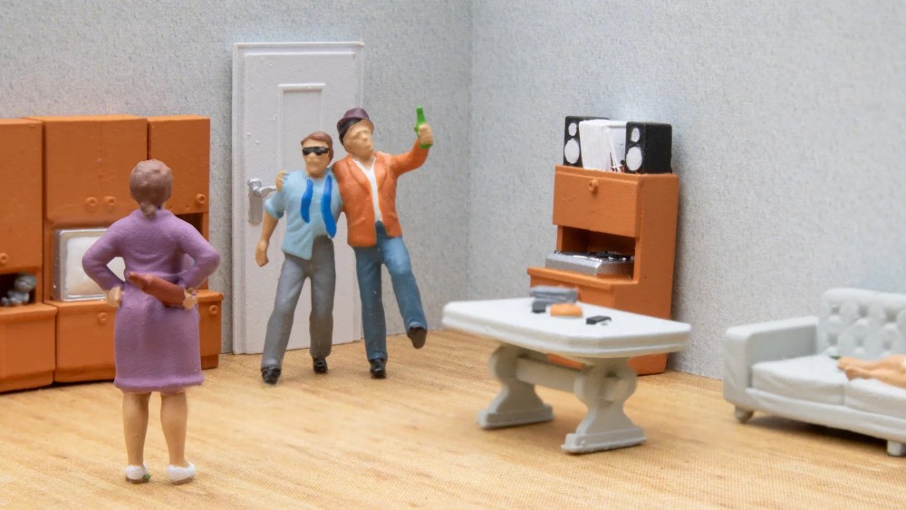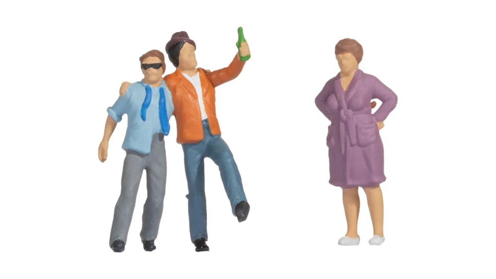 Az NOCH Vicces Jelenetek Készlet "Alkoholisták" egy humoros pillanatot ragad meg a mindennapi életből. Két vidám barát kéz a kézben, egy üveggel a kezükben tér haza, miközben egy elszánt hölgy karba tett kézzel és kritikus tekintettel fogadja őket. A jelenet mosolygós és emberi elemet visz a modelltájképedbe.
