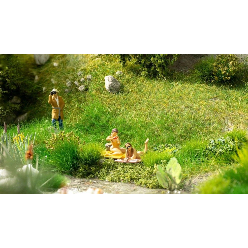 A NOCH Vicces Jelenetek "Kukkuló" készlet egy mosolygós nyári pillanatképet örökít meg. Két hölgy élvezi a napsütéses napot egy takarón terülve, míg egy kíváncsi úriember távcsővel figyeli a környezetet, talán egy kicsit intenzívebben, mint az helyénvaló lenne. A jelenet humort és enyhén provokatív perspektívát visz a modelltájképedbe.