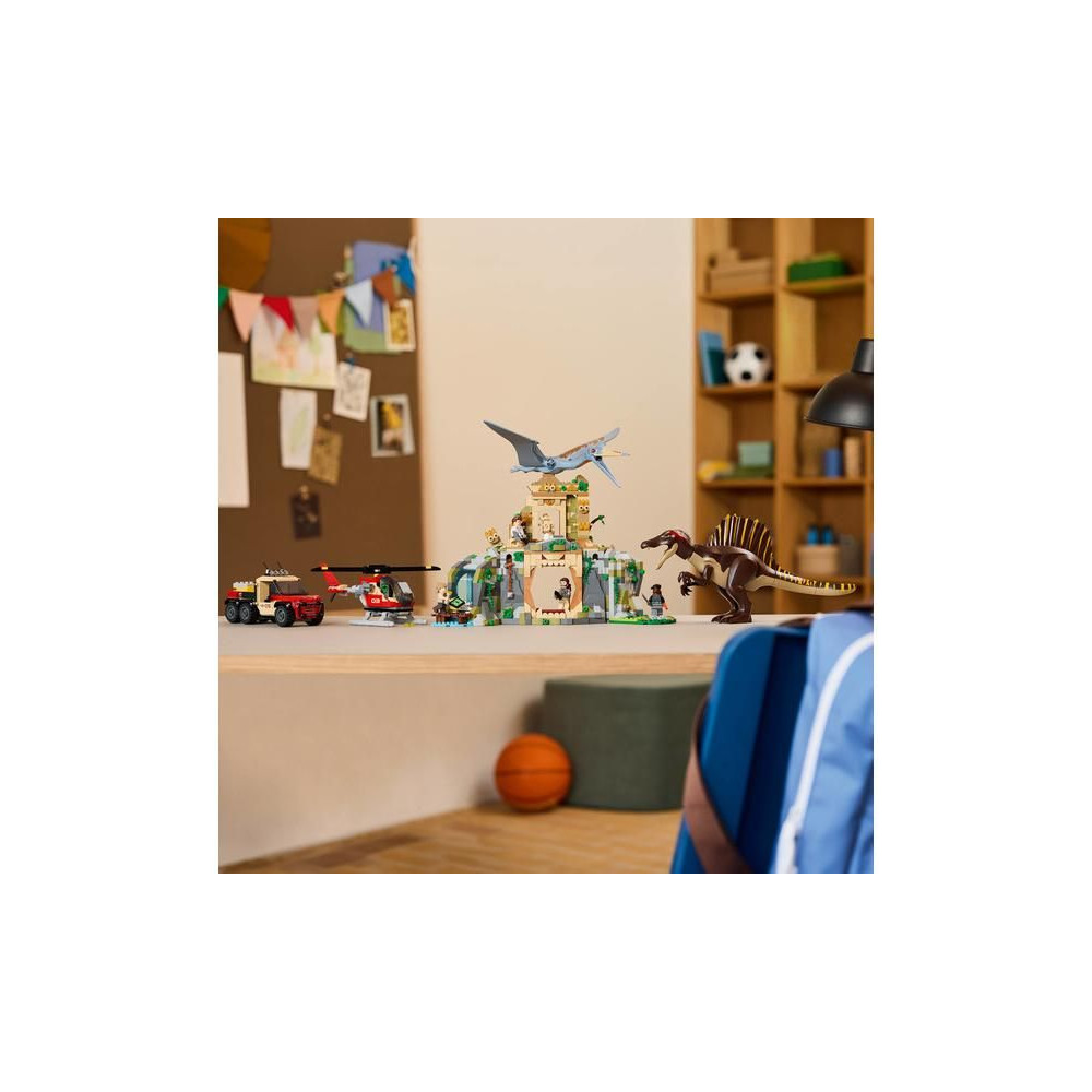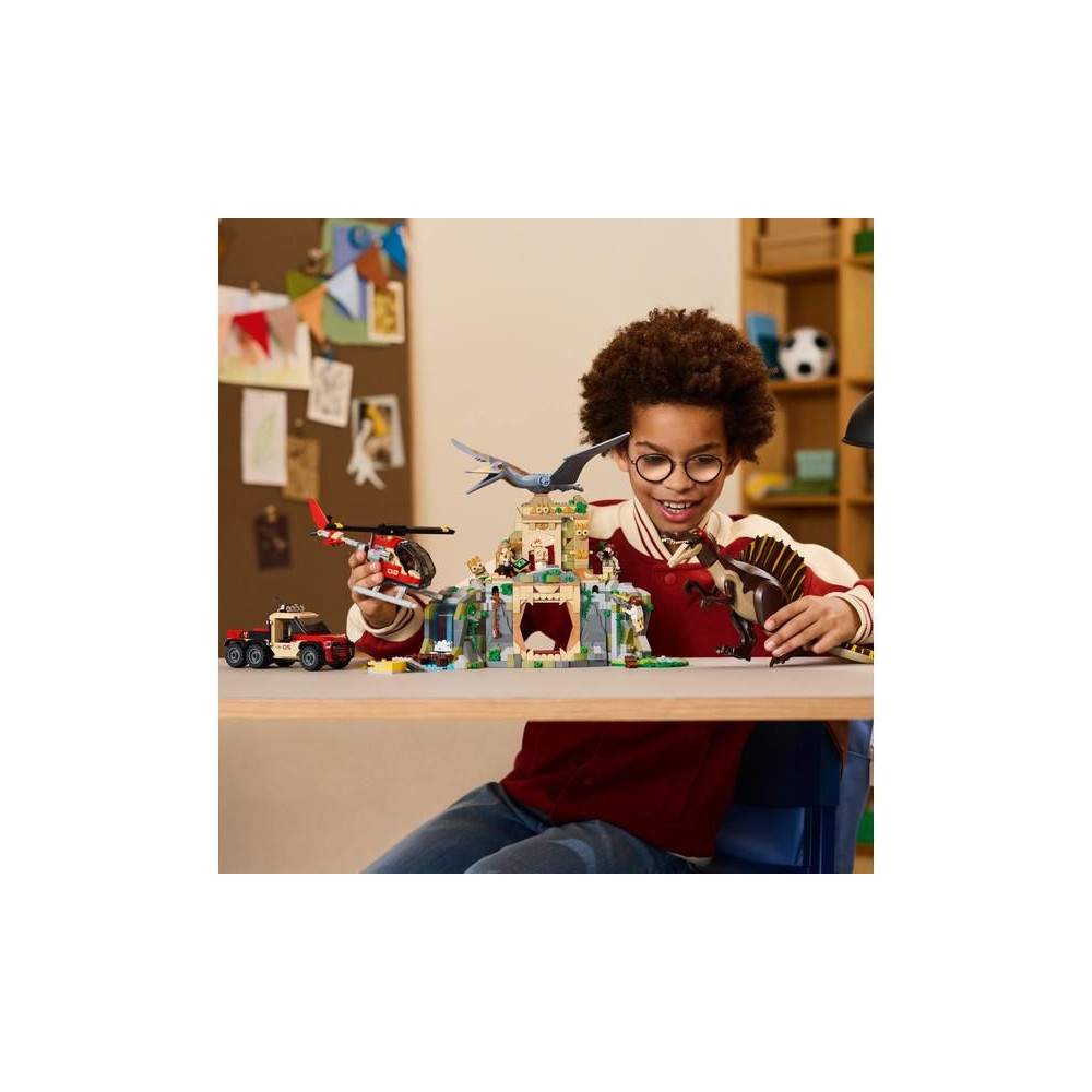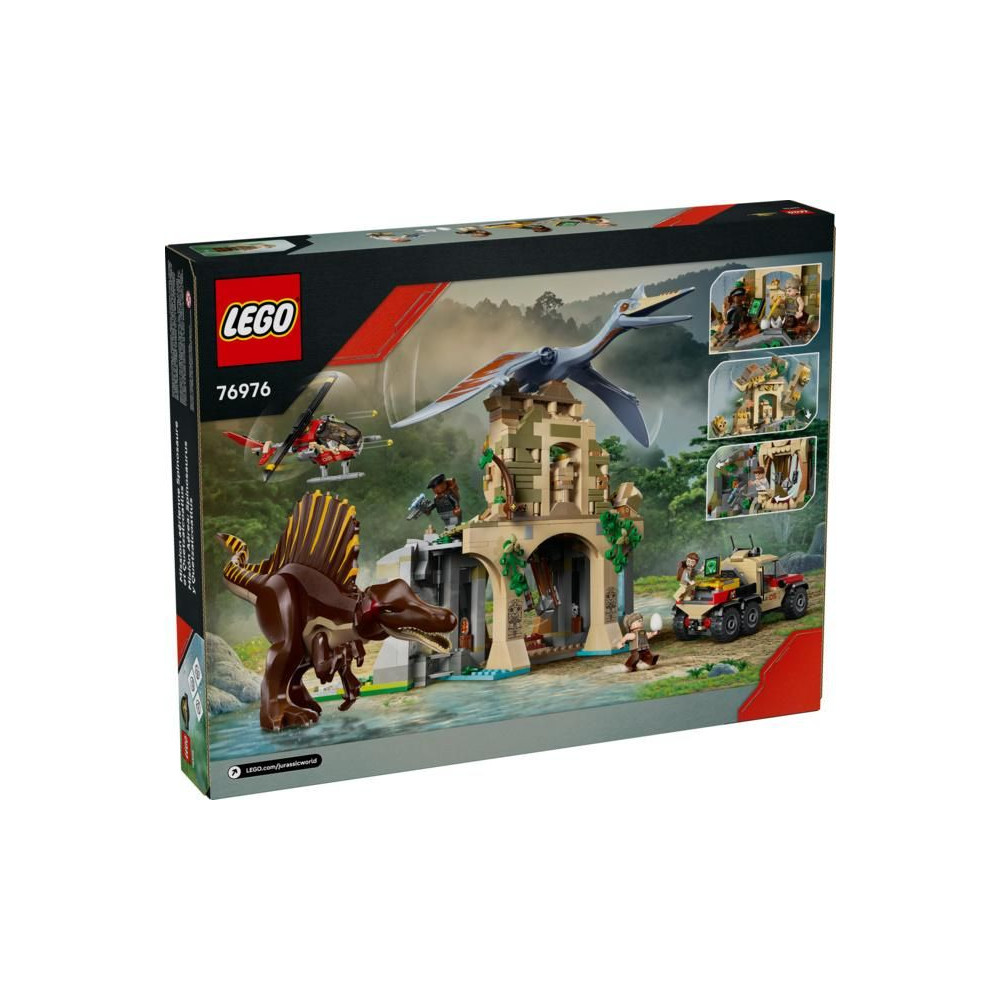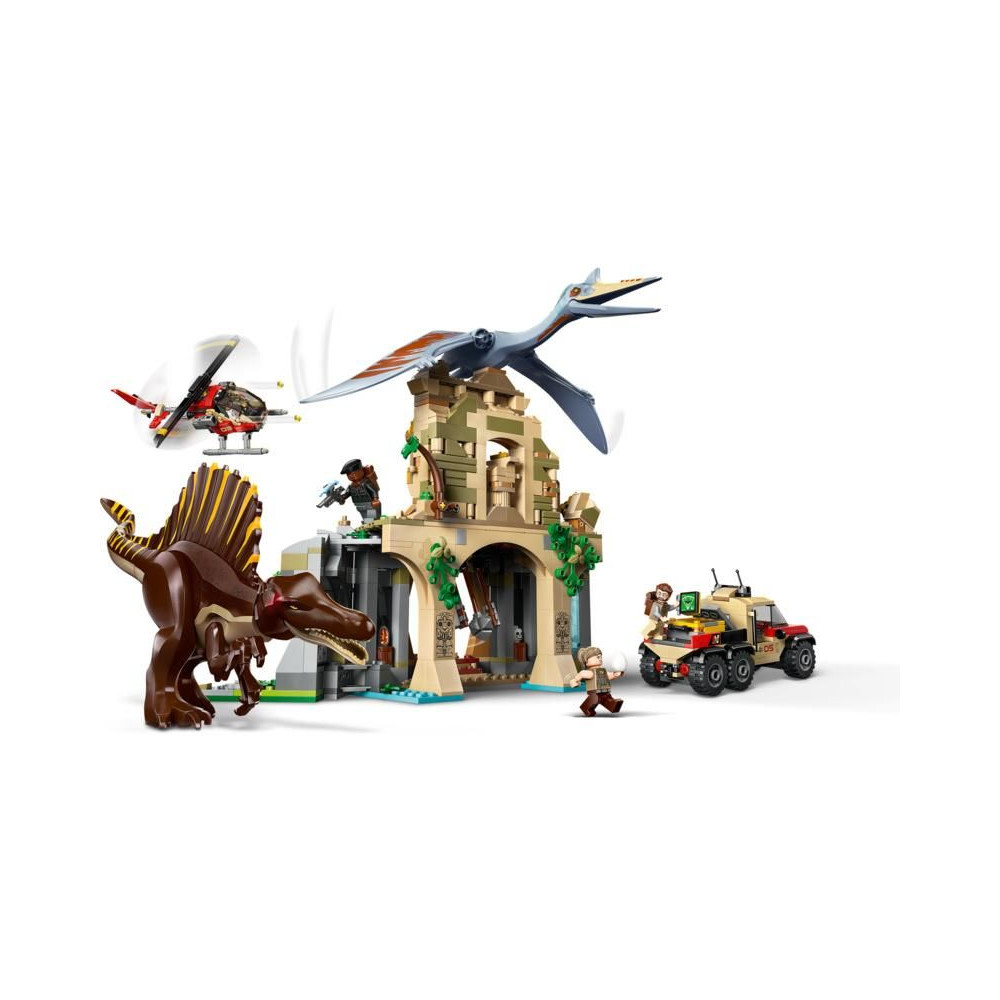 - Jurassic World: Újjászületés LEGO® Kockajátékok - Spinosaurus és Quetzalcoatl figurák, 4 filmes szereplő minifigura, egy ősi templom, egy helikopter, egy dinoszaurusz teherautó és rengeteg részlet