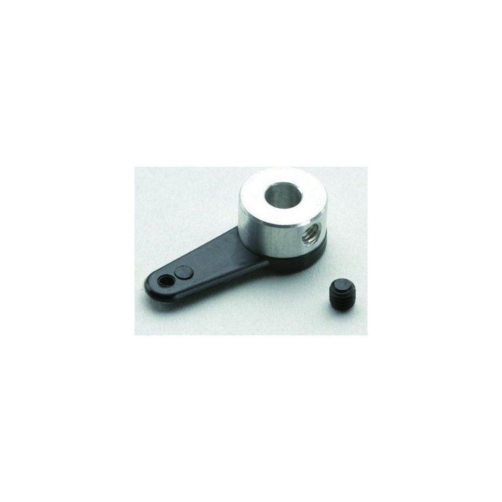 16 mm-es műanyag kormánykar 4 mm átmérőjű lyukkal és M3-as zárócsigával ellátott alumínium tengelycsonkkal. Teljes hossza 23,5mm, magassága 7mm, tengelyátmérője 9,5mm.
