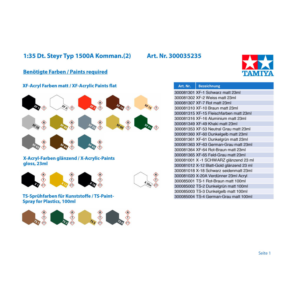 Počas druhej svetovej vojny sa vyrábalo veľa rôznych variantov Steyr Type 1500A / 01 Kommandeurwagen. Medzi nimi bola veľká 4-dverová verzia, ktorá mala zadný kufor a kožené sedadlá a bola často používaná vysokými predstaviteľmi a vojenskými veliteľmi na úradné účely. Tento Steyr je teraz reprodukovaný ako plastová montážna stavebnica. Výrazné krivky zaoblených oblastí kapoty a kufra boli presne reprodukované. Môžete si zvoliť montáž strechy, kapoty kufra a všetkých štyroch dverí v otvorenej alebo zatvorenej polohe. Kožené sedadlá majú realistický povrch. Súčasťou súpravy sú tri postavy, ktoré zobrazujú stojaceho dôstojníka držiaceho ďalekohľad, ako aj postavy sediaceho vodiča a generálneho dôstojníka.