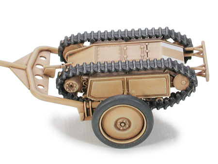 Celková dĺžka Kettenkraftradu: 64 mm. Sada obsahuje presne detailne spracované demolačné vozidlo Goliáš a pechotný vozík