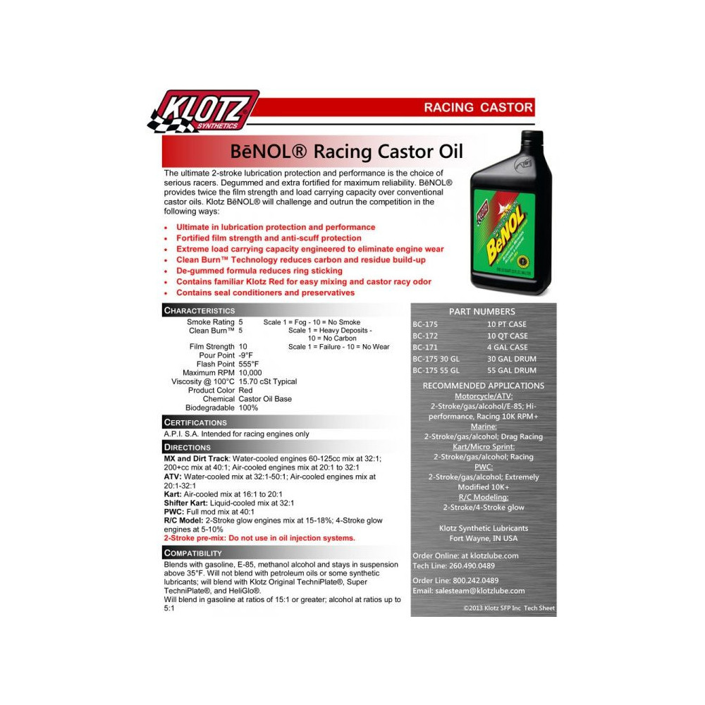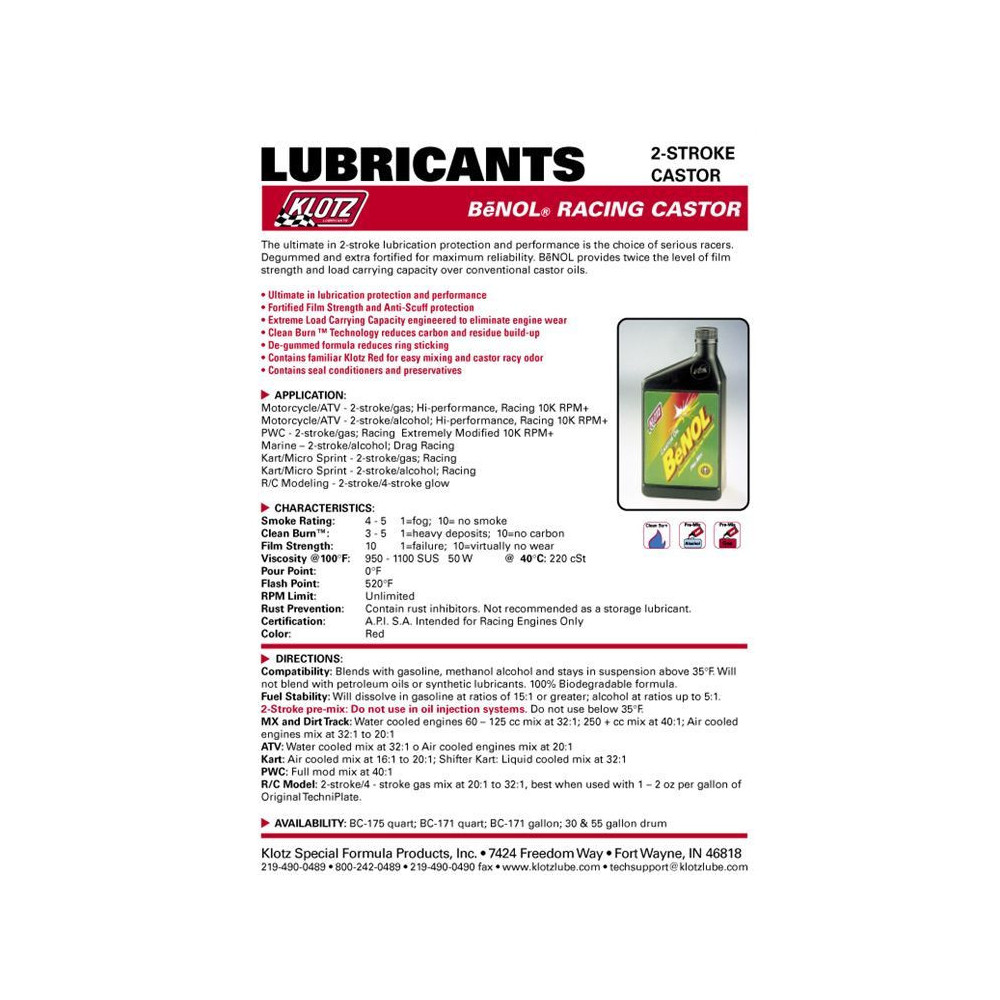 BeNOL®, najvyššia v dvojtaktnom mazive, pokiaľ ide o ochranu a výkon, je výber vážnych pretekárov. Degumované a extra opevnené pre maximálnu spoľahlivosť. BeNOL® poskytuje dvojnásobnú úroveň pevnosti filmu a nosnosti konvenčných ricínových olejov