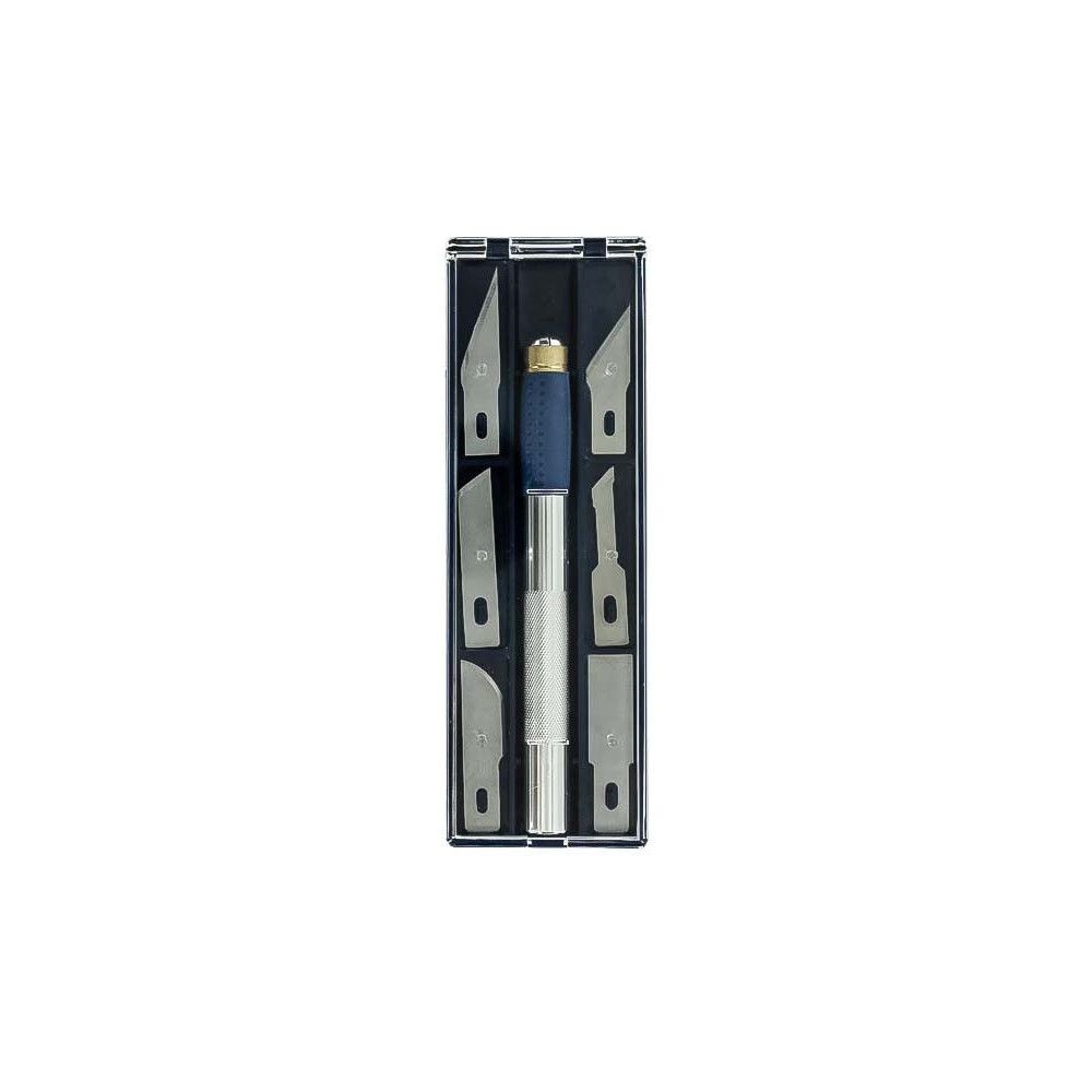 Modelcraft professzionális modellező kés #2 nagy, 6db pengével. Ez a 7 darabos készlet a következőket tartalmazza: minőségi #2 nyél beépített puha komfortos markolattal, mágneses vég a pengék vagy más fém alkatrészek kiemeléséhez, 6db #2 penge, műanyag doboz. Kézműveseknek, modellezőknek és profiknak.