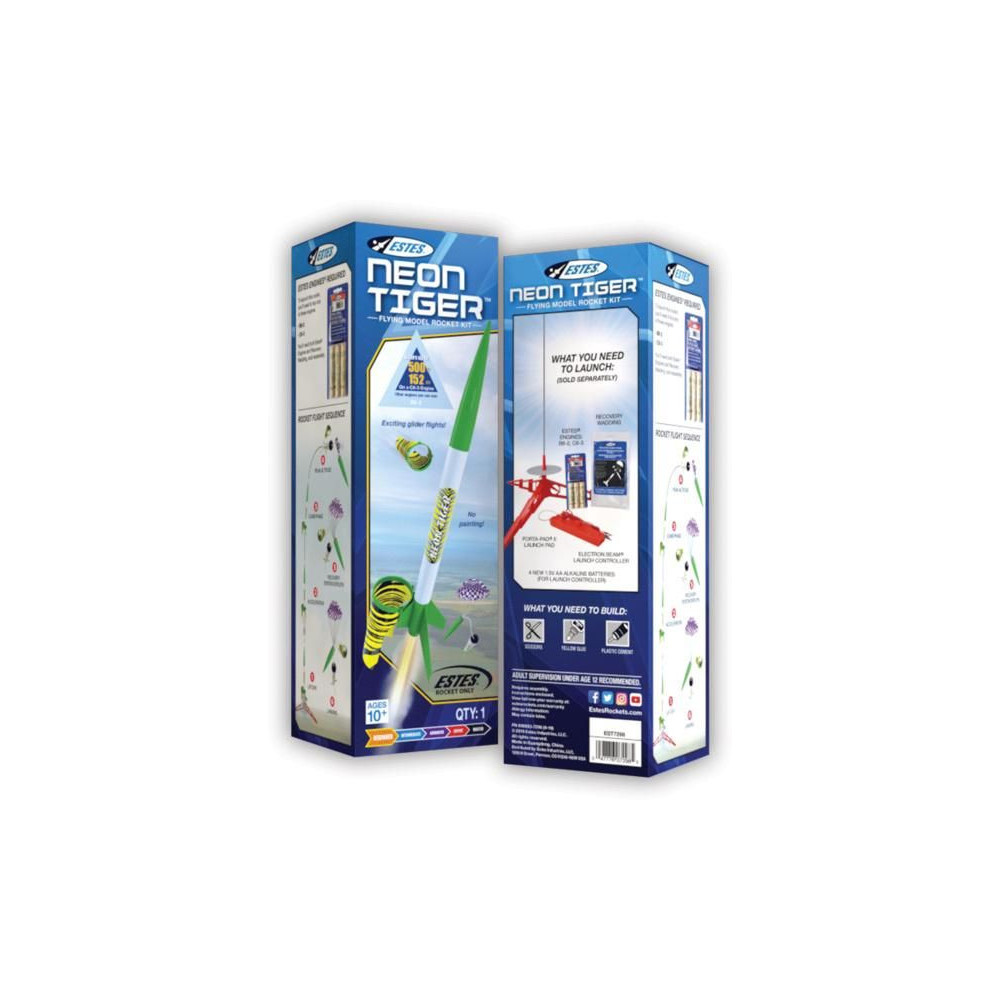 Az Estes Neon Tiger készlet a B-C sorozatú rakétamotorokhoz készült. A rakéta klasszikus formáját kiegészíti egy kiegészítő siklóernyő, amely leválik és lassan landol, miközben a rakéta lassan visszatér az ejtőernyőn. A rakéta 152 m magasságig repül, és a 38,1 cm átmérőjű ejtőernyőnek köszönhetően ereszkedik le a földre.