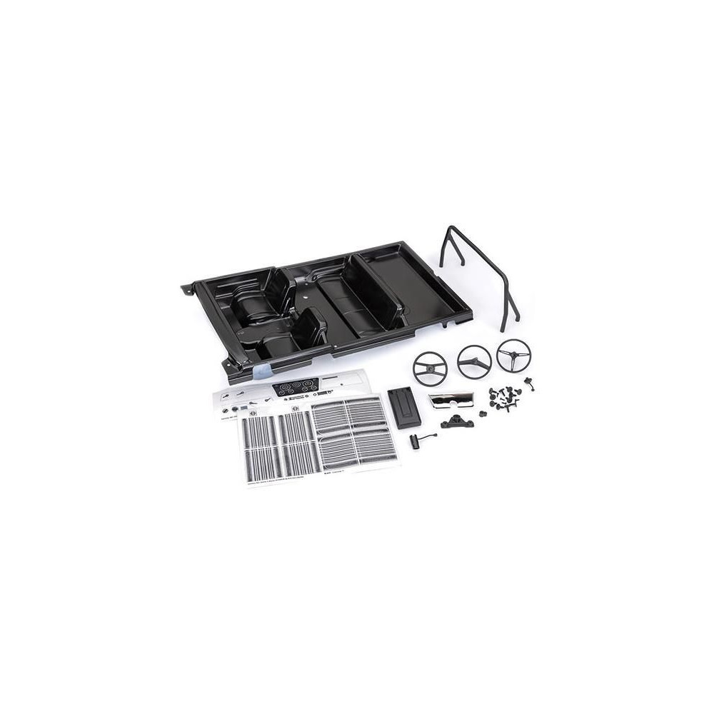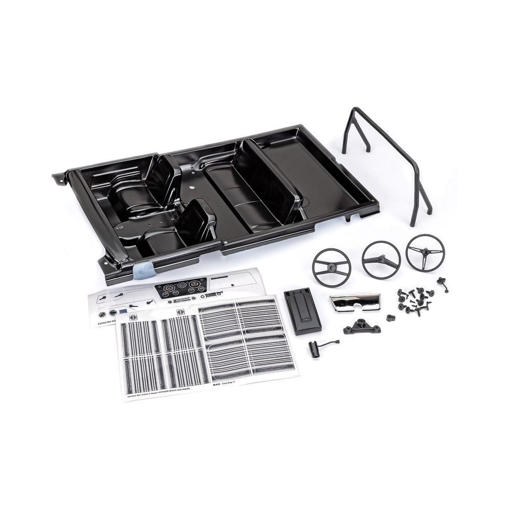 Traxxas belső fekete a TRX-4 Chevrolet Blazer 1969-1972-es TRX-4 Chevrolet Blazerhez, klipszes rögzítő rendszerrel. A csomag tartalmazza a belső kádat, a mock-up tartozékokat (védőkeret, műszerfal, kormánykerék, váltó és középső panel), részletes matricákat.