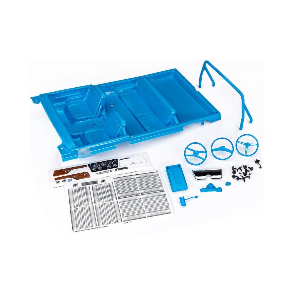 Traxxas belső kék TRX-4 Chevrolet Blazer 1969-1972-es Chevrolet Blazerhez, klipszes rögzítő rendszerrel. A csomag tartalmazza a belső kádat, a mock-up tartozékokat (védőkeret, műszerfal, kormánykerék, váltó és középső panel), részletes matricákat.
