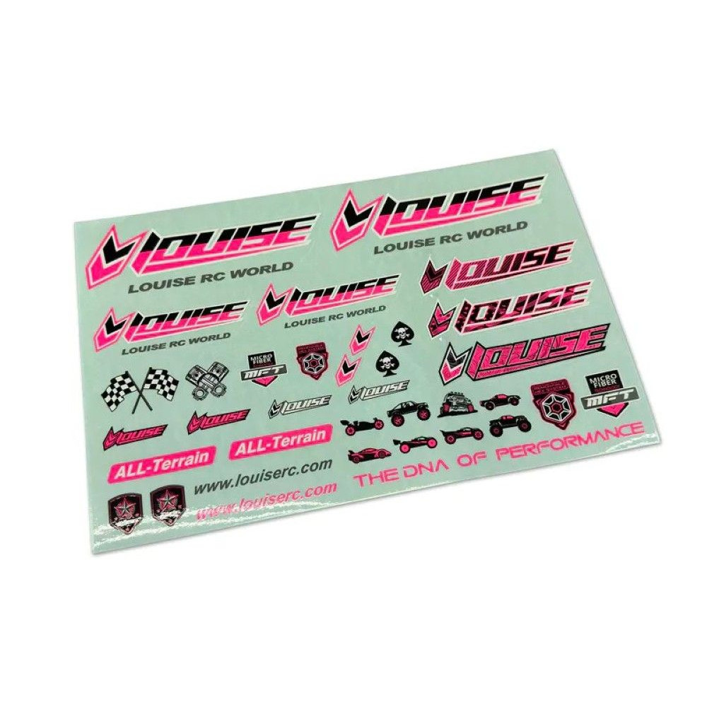 Louise RC - A rózsaszín RC matricák friss és eredeti megjelenést kölcsönöznek RC modellednek. A neves Louise RC gyártó matricakészletét kiváló minőségű anyag és külső hatásokkal szembeni ellenállás jellemzi. Az egyetlen lapon található széles grafikai motívumválasztéknak köszönhetően könnyedén létrehozhatsz professzionális megjelenésű dizájnt, amely garantáltan magára vonzza a figyelmet a depókban és magán a pályán is.