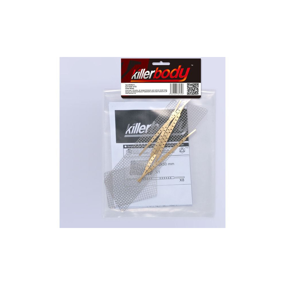 Tegye még valósághűbbé RC autómodelljét. A Killerbody rozsdamentes acélhálót kínál Önnek az autó hátsó részéhez és a karosszéria első vezetőablakához, amelyet sárgaréz csíkokkal rögzít. RC autómodellje igazi versenyautóvá válik.