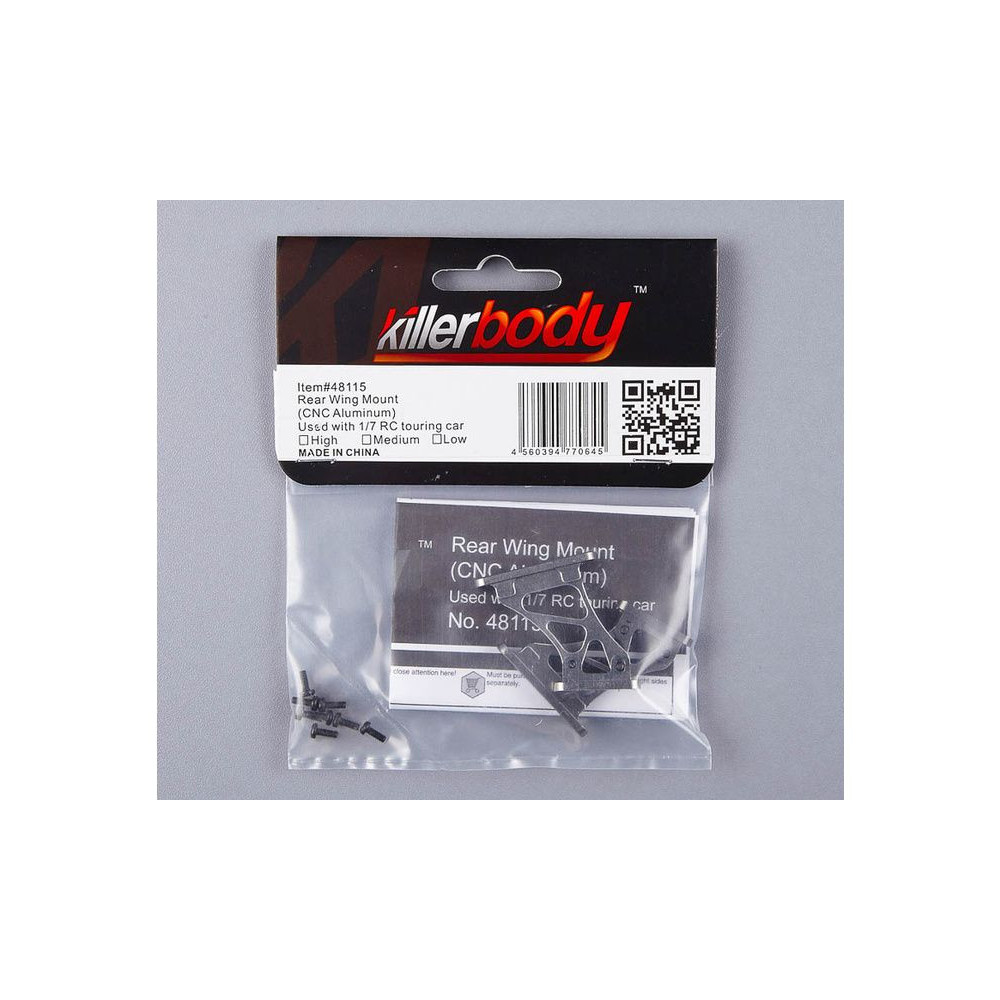 A Killerbody magas, szürke alumínium merevítőkkel kínálja a szárnyat az 1:7-es RC modellautók karosszériájához való rögzítéshez. A csomag tartalmazza a merevítőket, a rögzítő készletet.