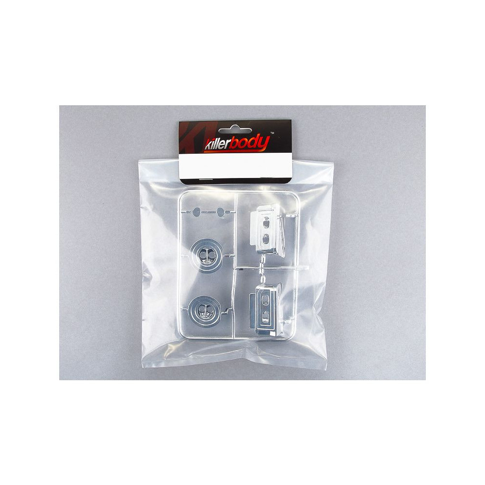 Killerbody által készített fényszóró parabolák Lancia Stratos 1:10 RC modellekhez. A csomag tartalmaz krómozott műanyag betéteket az első és hátsó lámpákhoz, tükörlencséket rögzítőkészlet nélkül.