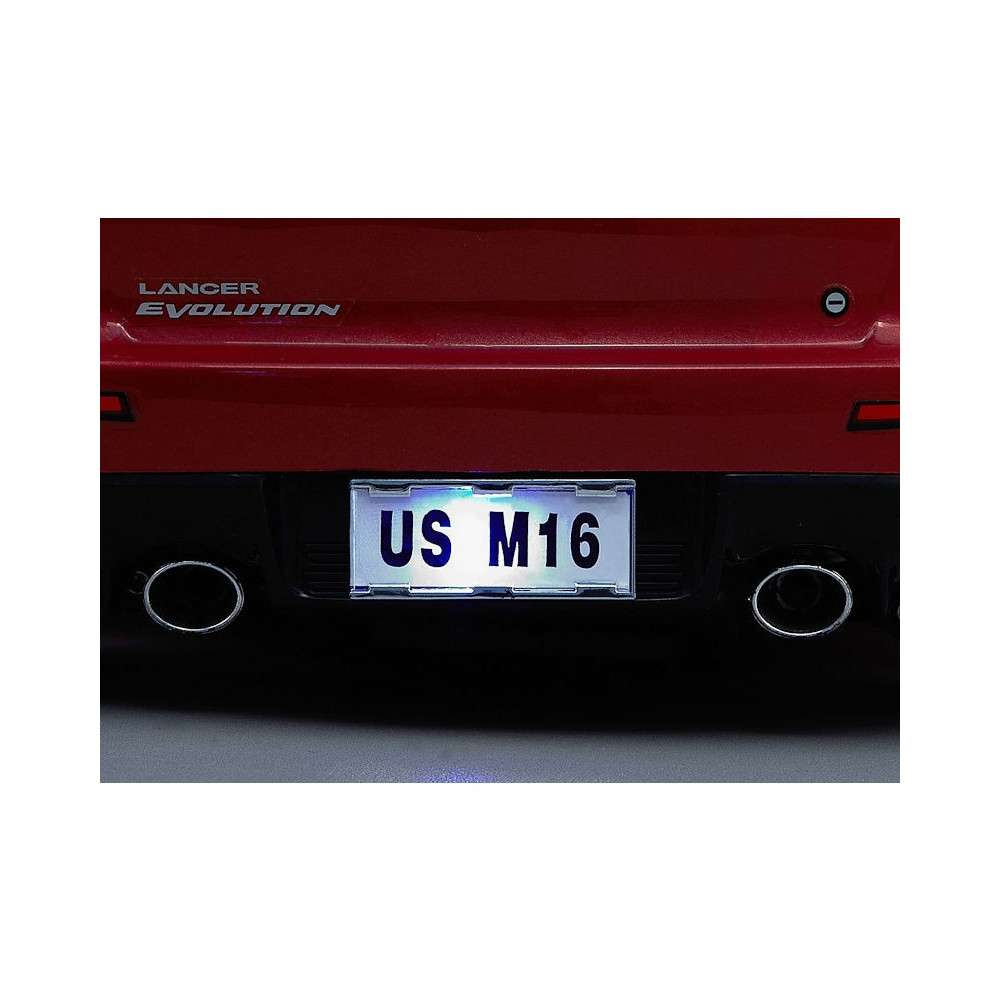 A rendszámtábla keret ABS anyagból készült krómozott, melyre egy 6 LED-et tartalmazó csíkot ragasztasz ( fehér fénnyel világítanak ). A rész átlátszó lexan, melyre egy matricát ragasztasz a rendszámtáblával. A rendszámtáblával ellátott lexánt ezután a LED-ekkel ellátott krómkeretbe illesztjük. a teljes keretet a modellautó hátsó karosszériájára rögzítjük a rögzítő tartozékok segítségével.