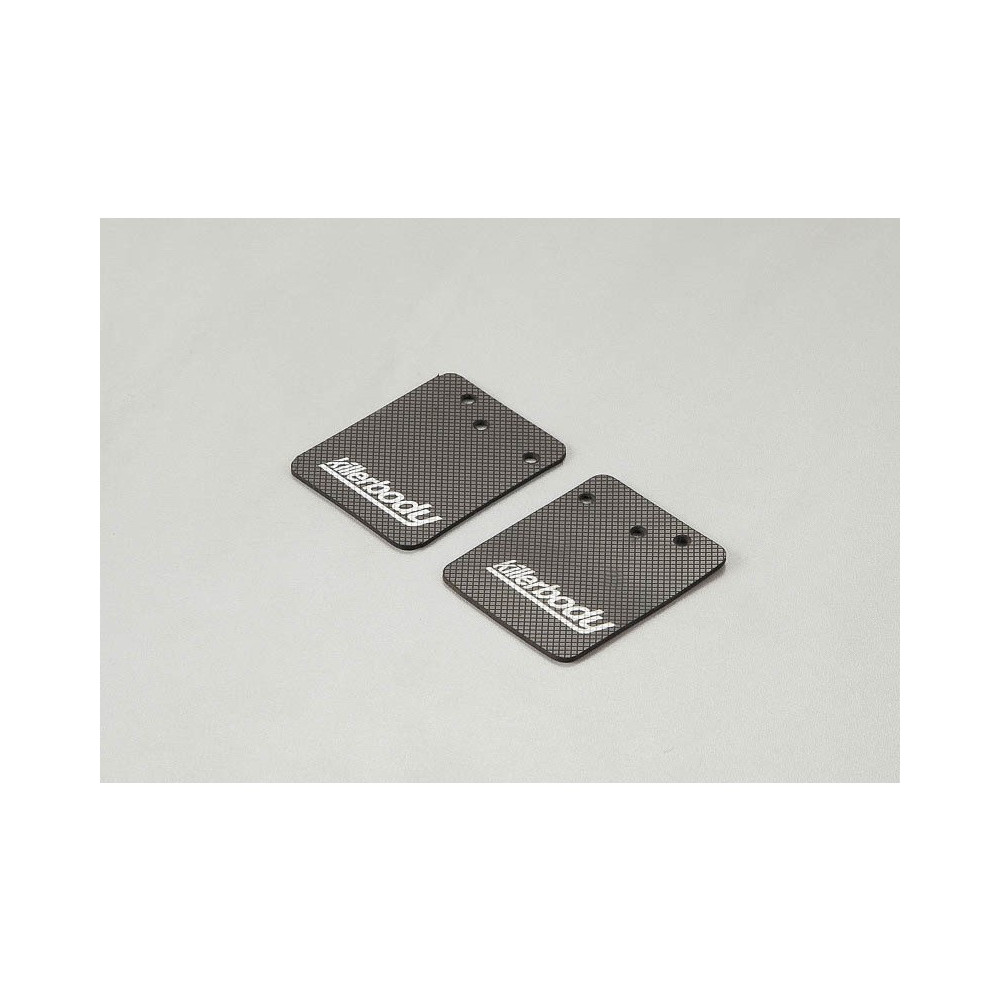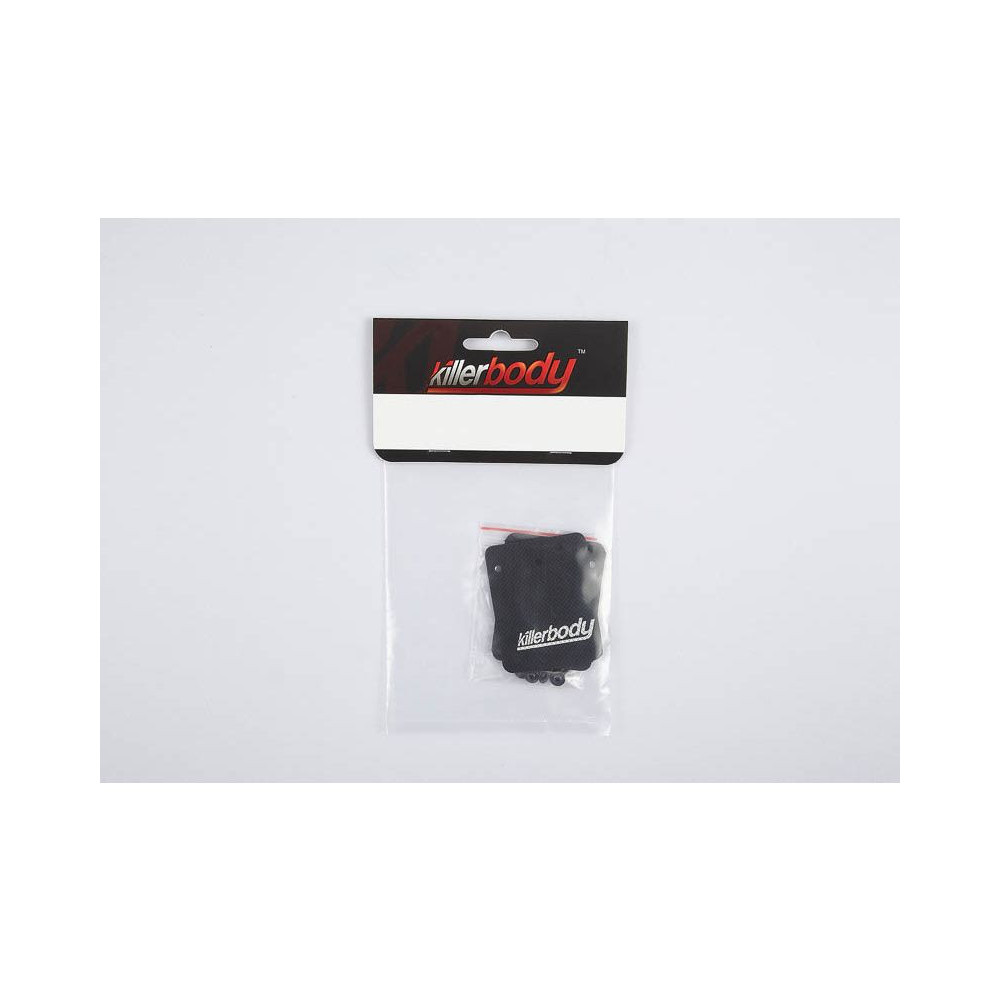 Fekete gumi kötények RC modellautóhoz. A csomag 2 darabot tartalmaz, Killerbody logóval 43 x 55 mm, csavarokkal a rögzítéshez.