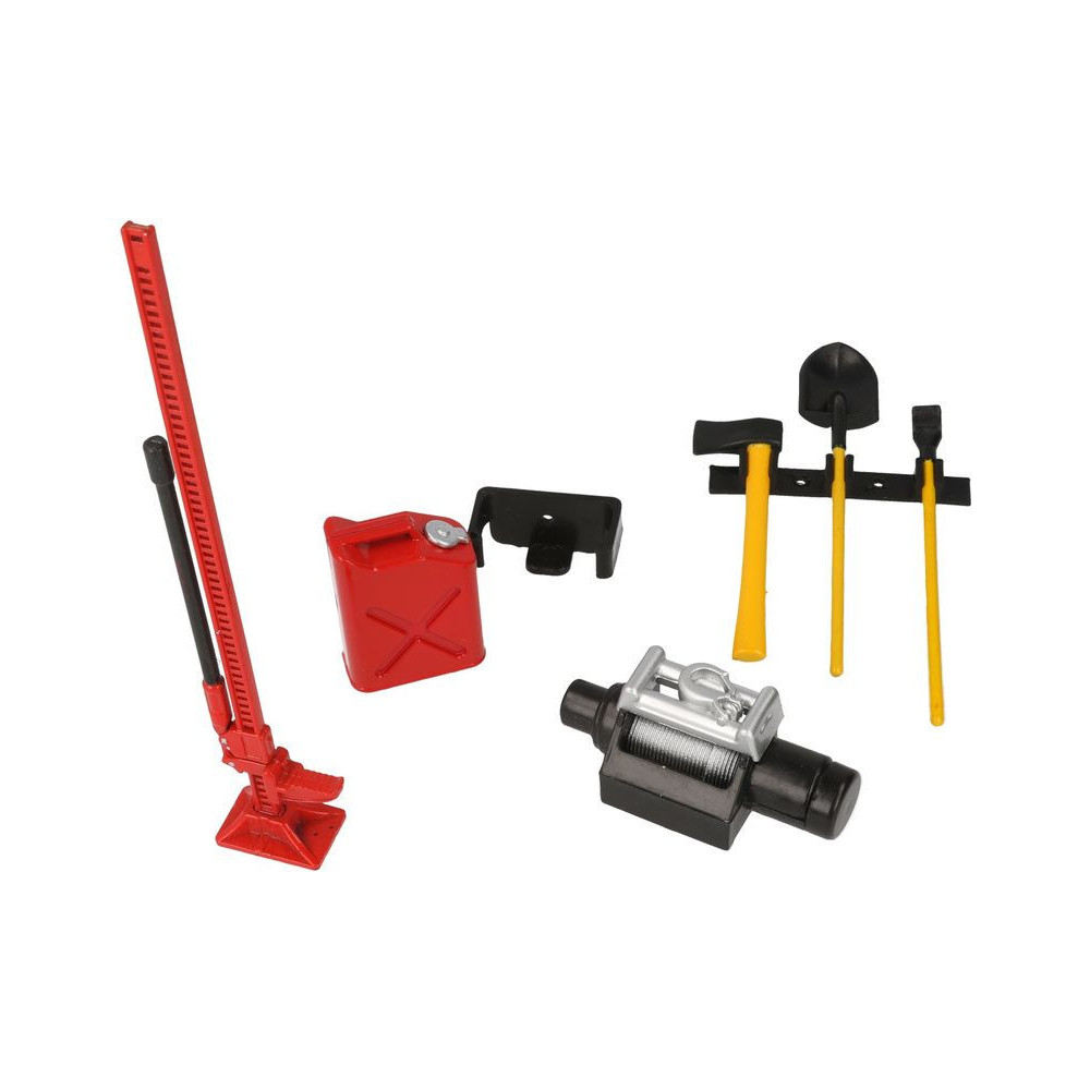 A Robitronic részletes maketteket kínál az RC-autómodellek szerszámairól. A makettek tartós műanyagból készülnek, piros színben. A készlet tartalmaz baltatartót, ásót, emelőt, benzinkannatartót, csörlőt, magas emelőt.