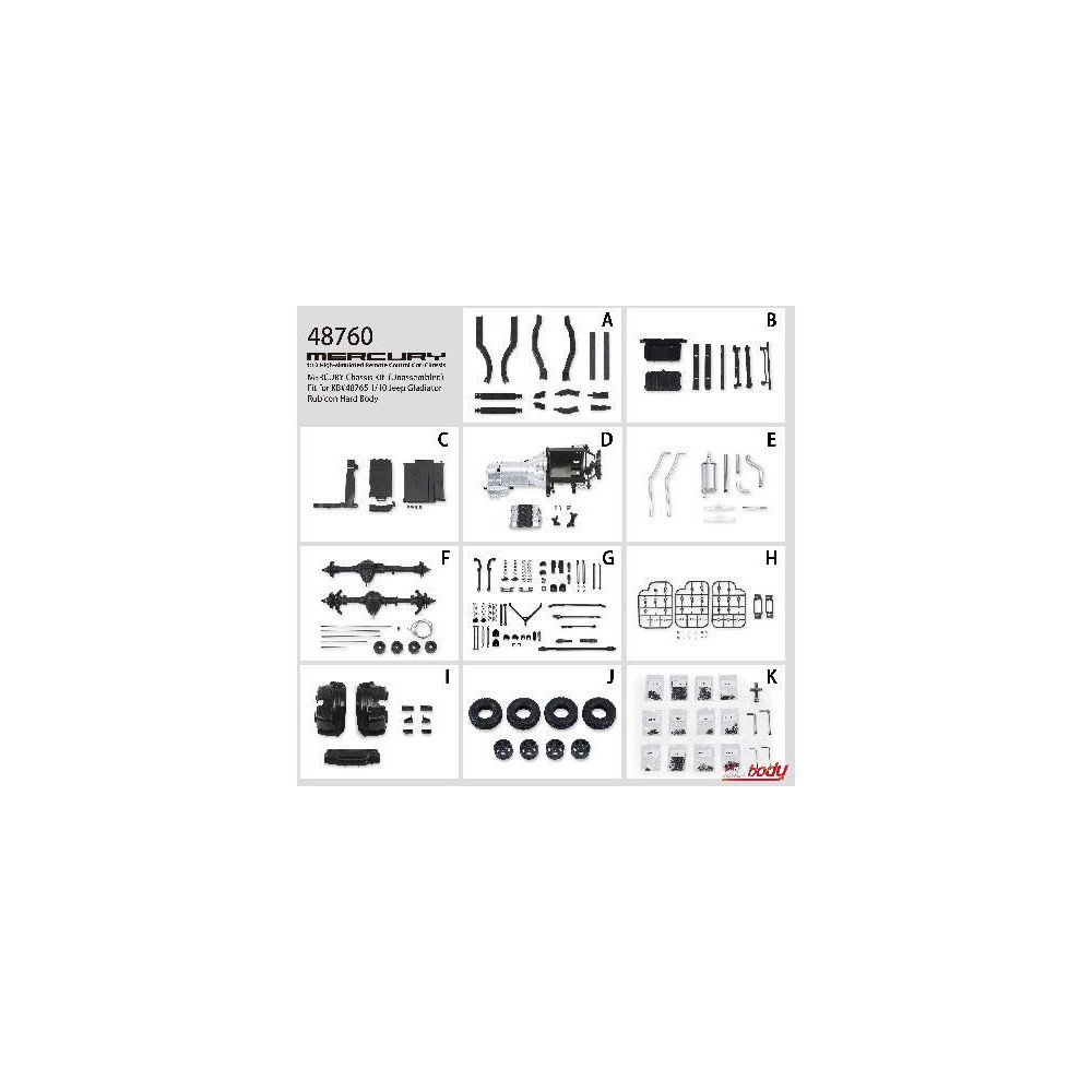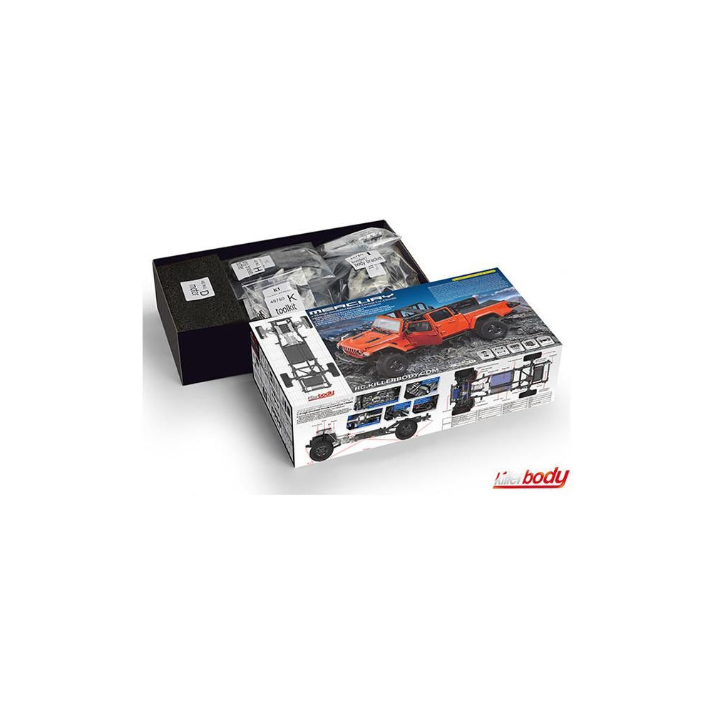 Killerbody Mercury 1:10 RC készlet a Killerbody Jeep Gladiator Rubicon karosszériához. Az alváz többelemes egyenes tengelyes felfüggesztést, differenciálzárakat, 2 sebességes sebességváltót, 2WD vagy 4WD kapcsolást, műmotort és kerekeket tartalmaz. Az elektronika és a karosszéria külön megvásárolható.