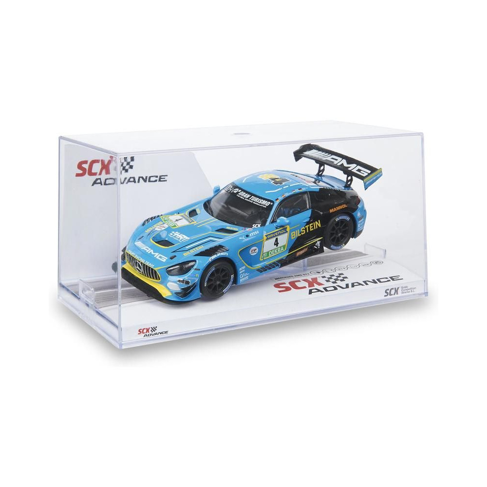 SCX Advance Mercedes AMG GT3 Bilstein pályaautó 1:32 méretarányban, 2.0 verzióban, SCX Advance digitális pályákhoz. A játékautó LED világítással van felszerelve. Az alvázon digitális/analóg kapcsoló található - a játékautó így a digitális SCX Advance pályán és az SCX Classic analóg pályán is használható.