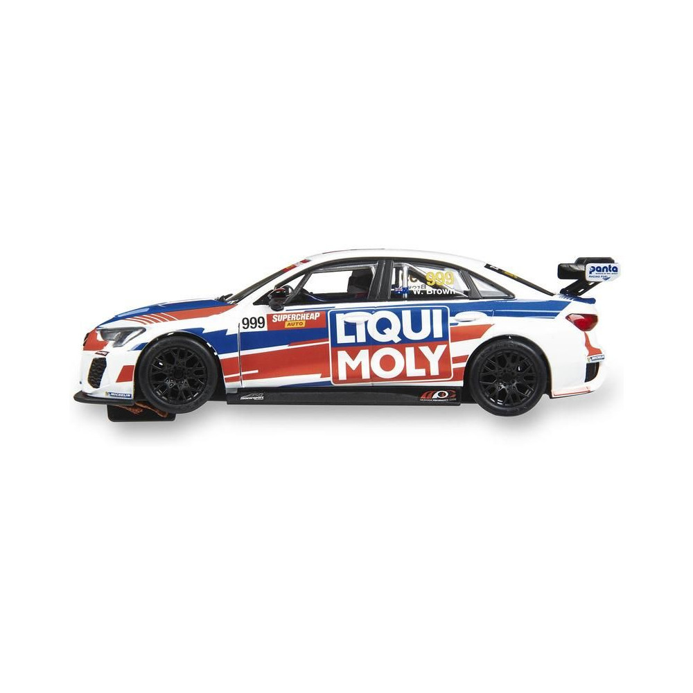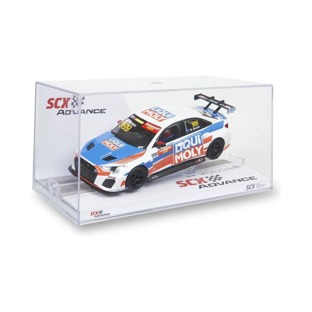 SCX Advance Audi RS3 LMS TCR Liqui Moly pályaautó 1:32 méretarányban, 2.0 verzióban, SCX Advance digitális pályákhoz. A játékautó LED világítással van felszerelve. Az alvázon digitális/analóg kapcsoló található - a játékautó így a digitális SCX Advance pályán és az SCX Classic analóg pályán is használható.