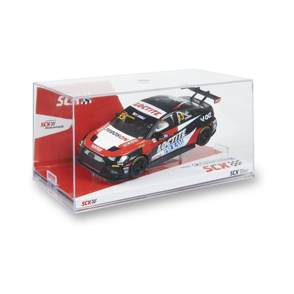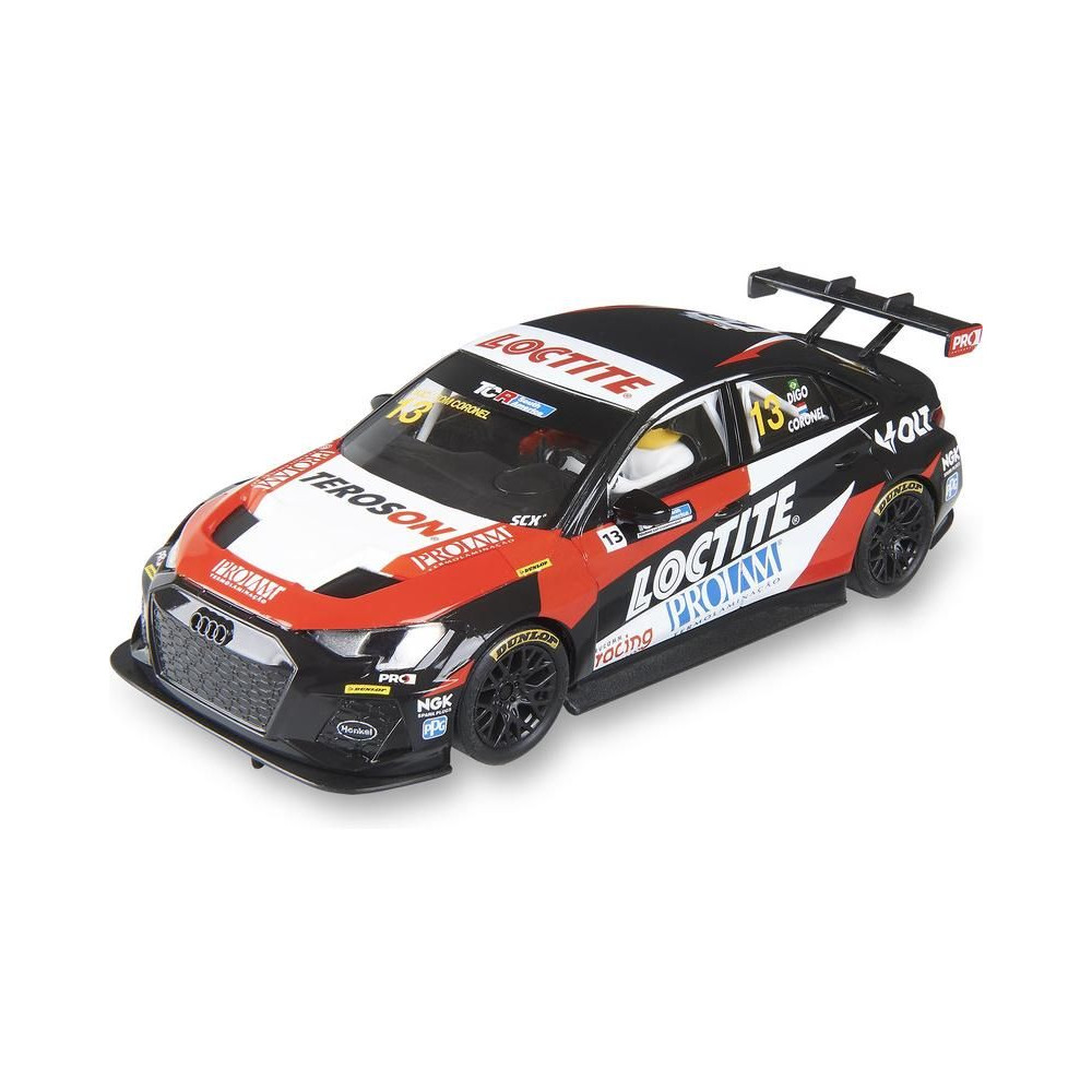SCX Classic Audi RS3 LMS TCR Loctite pályaautó 1:32 méretarányban, világítással, SCX Classic analóg pályákhoz. Ha kiegészíted az SCX Advance A típusú - hosszú SCXE10405X200 átalakító készletet, az autót használhatod az Advance pályán is.