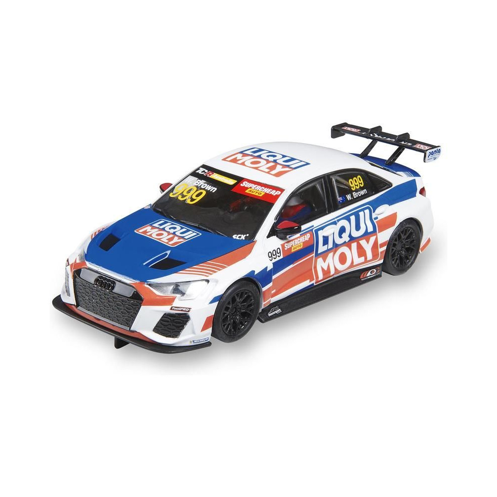 SCX Classic Audi RS3 LMS TCR Liqui Moly pályaautó 1:32 méretarányban, világítással, SCX Classic analóg pályákhoz. Ha kiegészíted az SCX Advance A típusú - hosszú SCXE10405X200 átalakító készletet, az autót használhatod az Advance pályán is.