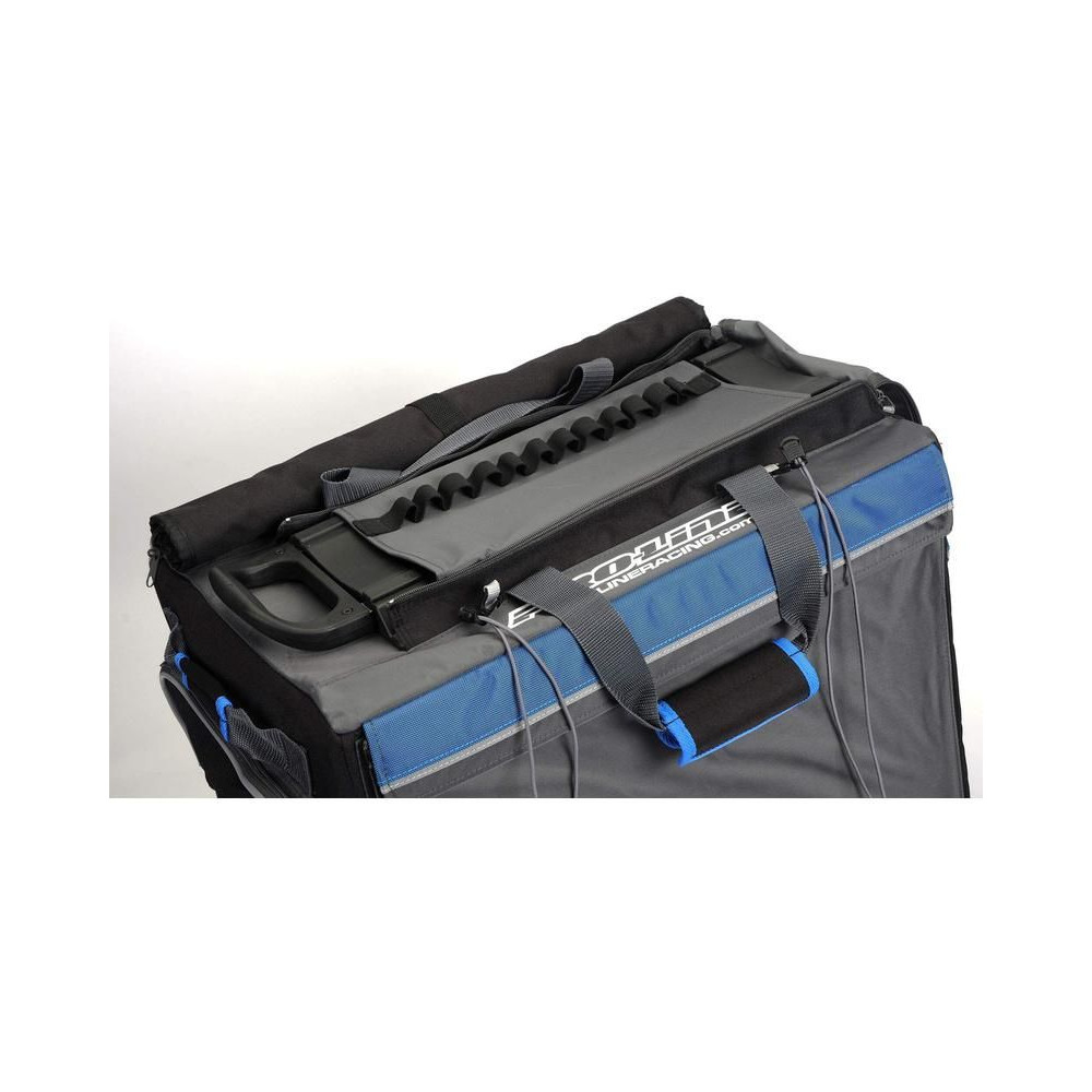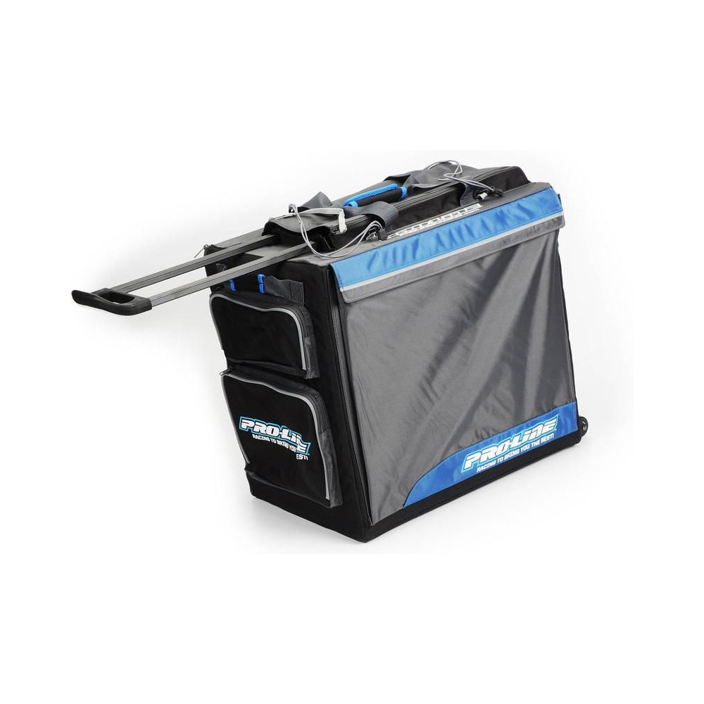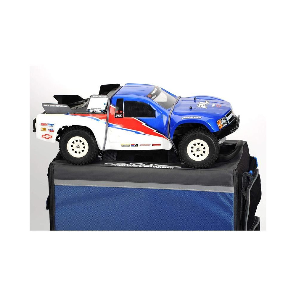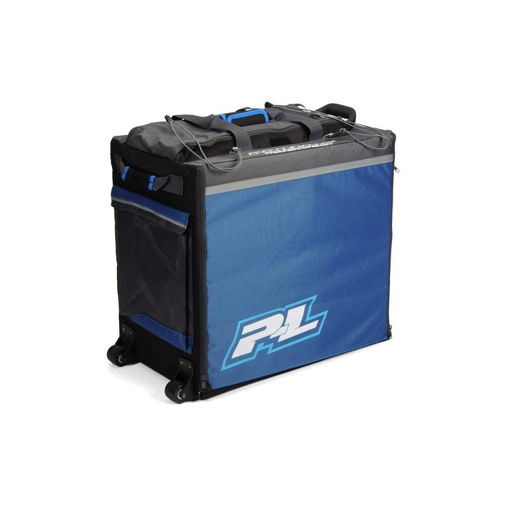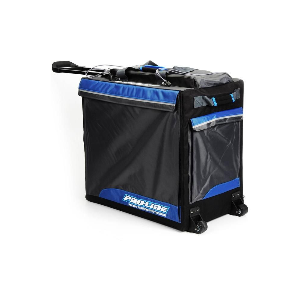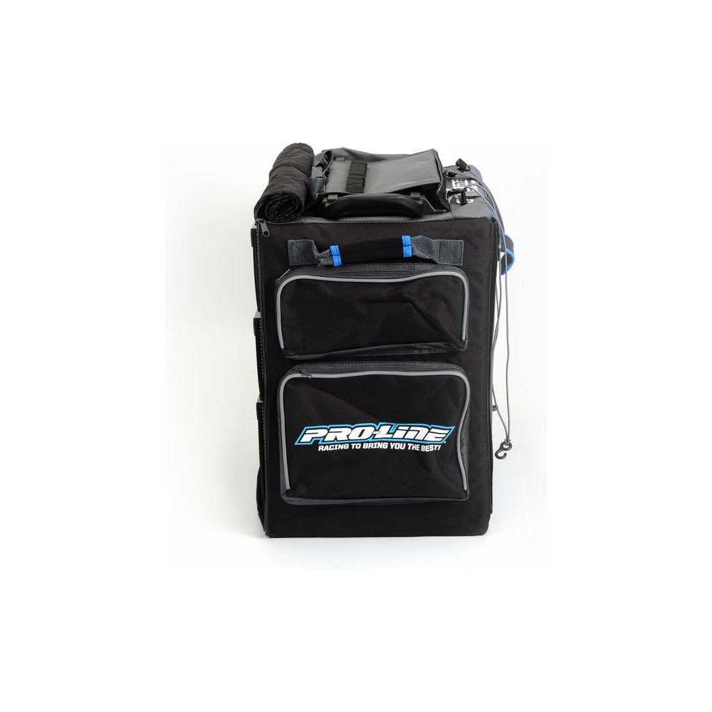 Pro-Line utazótáska, RC modellautók és tartozékok tárolására és szállítására alkalmas. 4 rekesz, további cipzáras zsebek, szerszámszervező, szorítóheveder a modell rögzítéséhez. Kiváló minőségű görgők és összecsukható fogantyú. Stílusos Pro-Line logók az oldalakon.