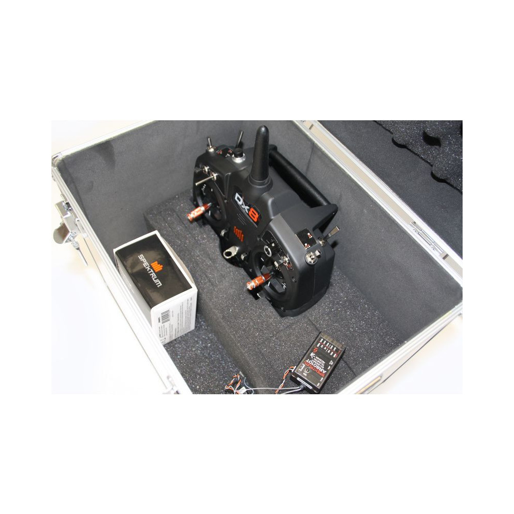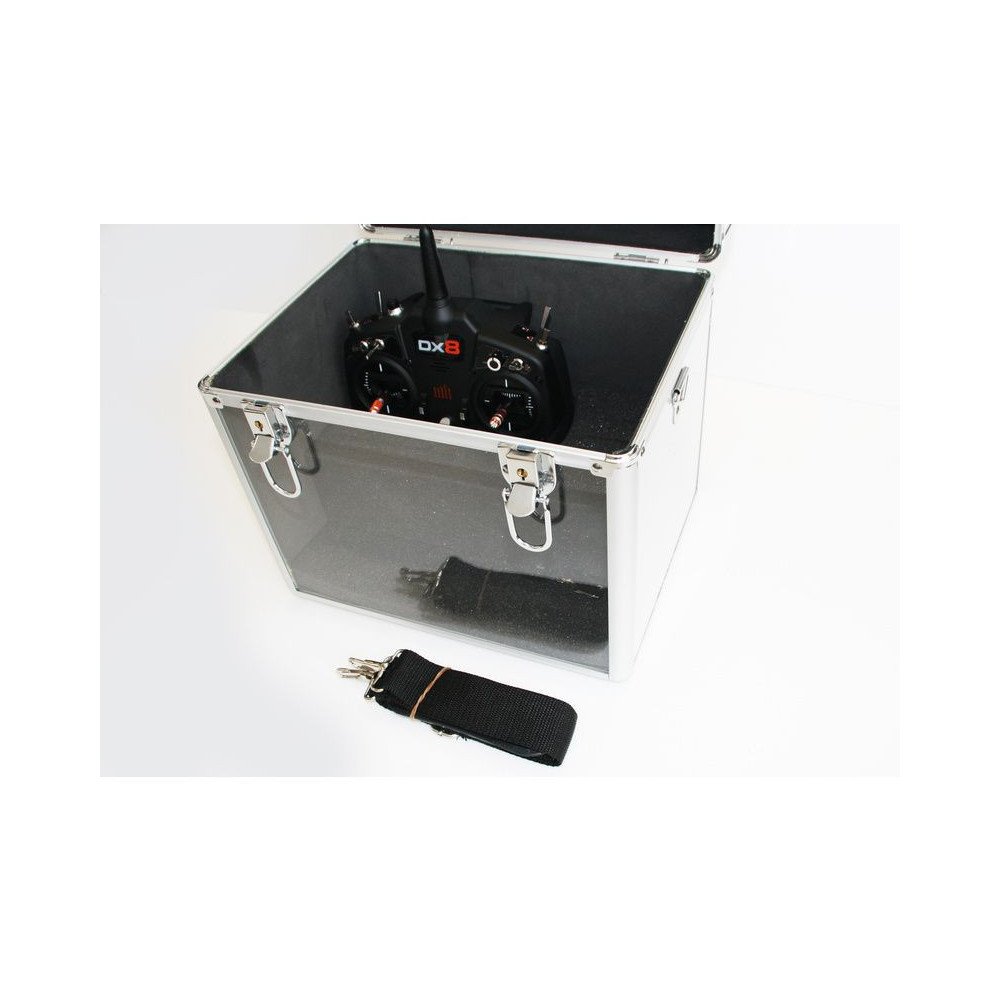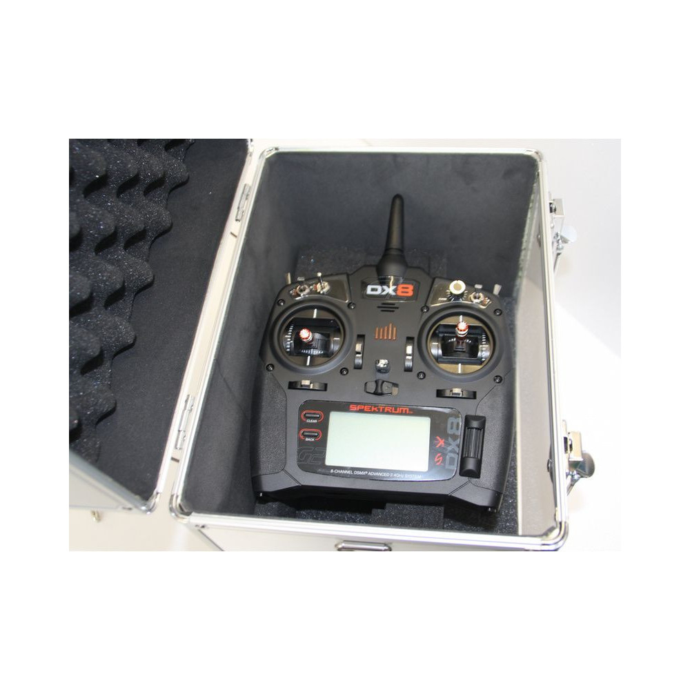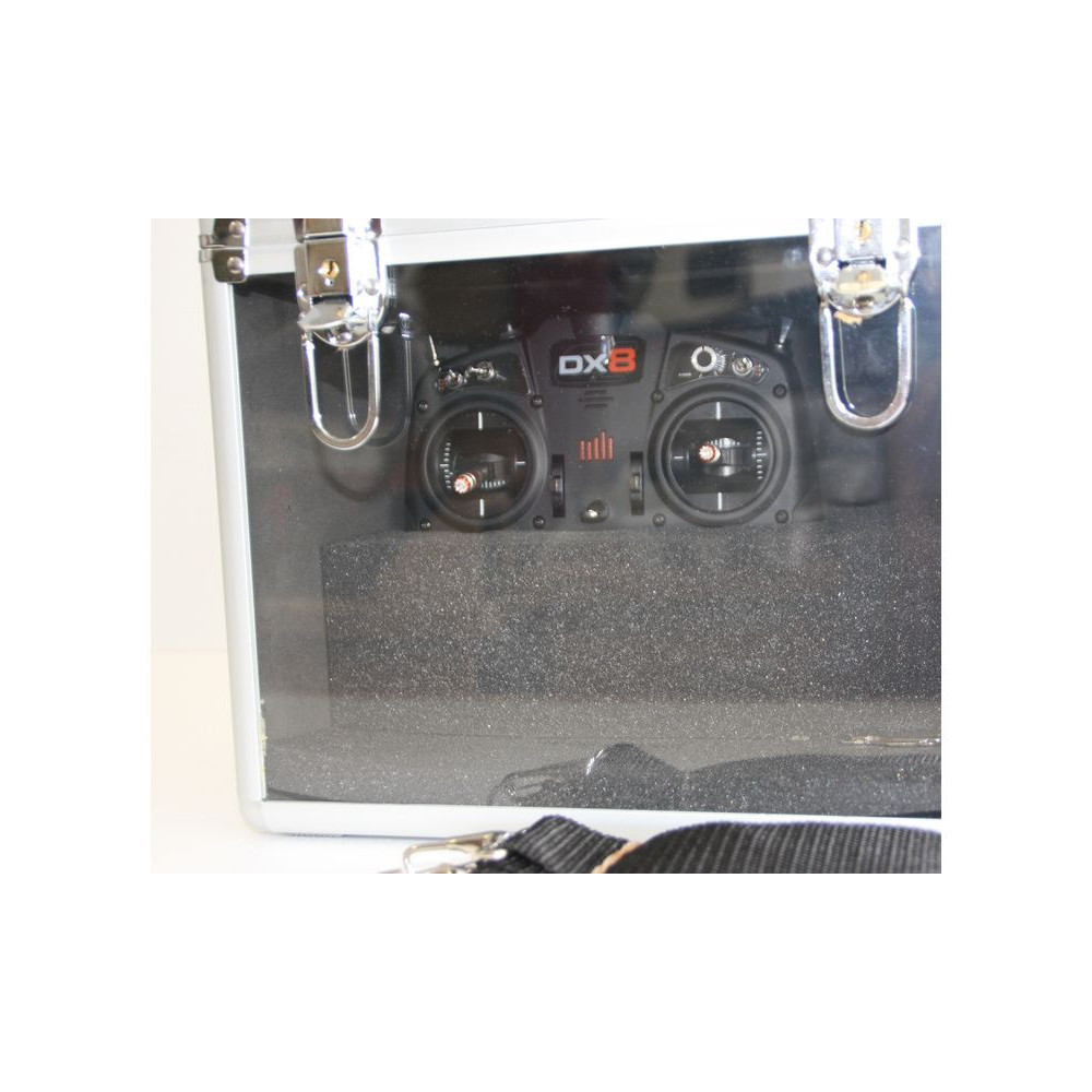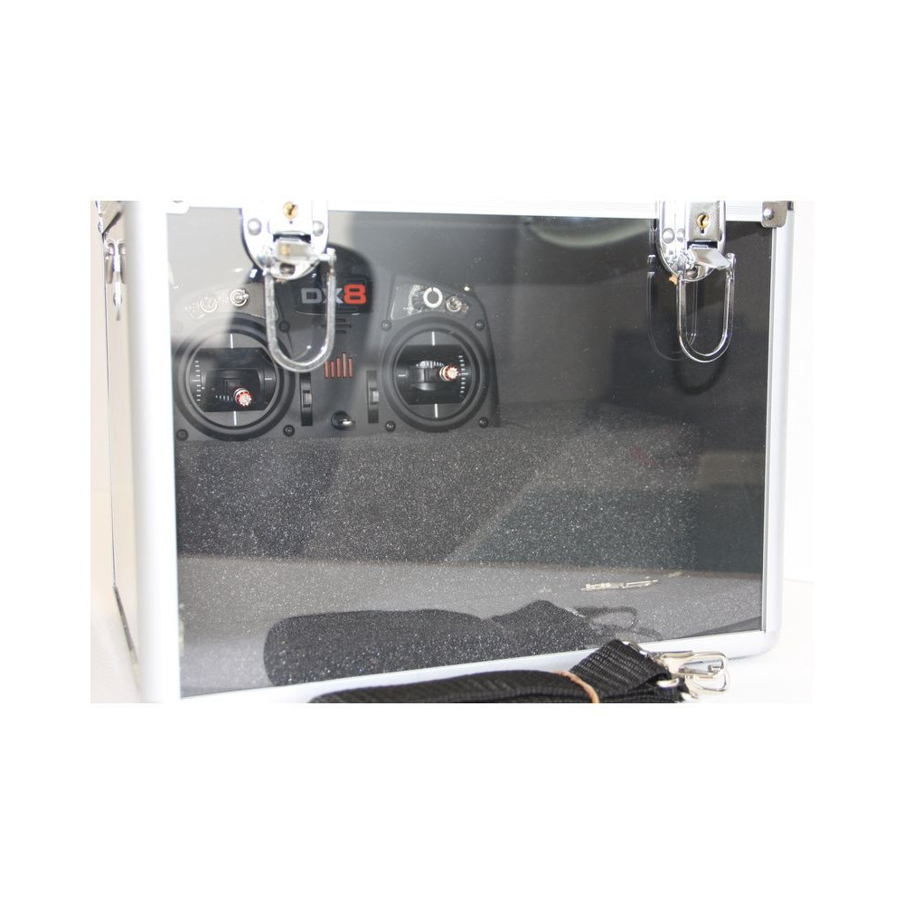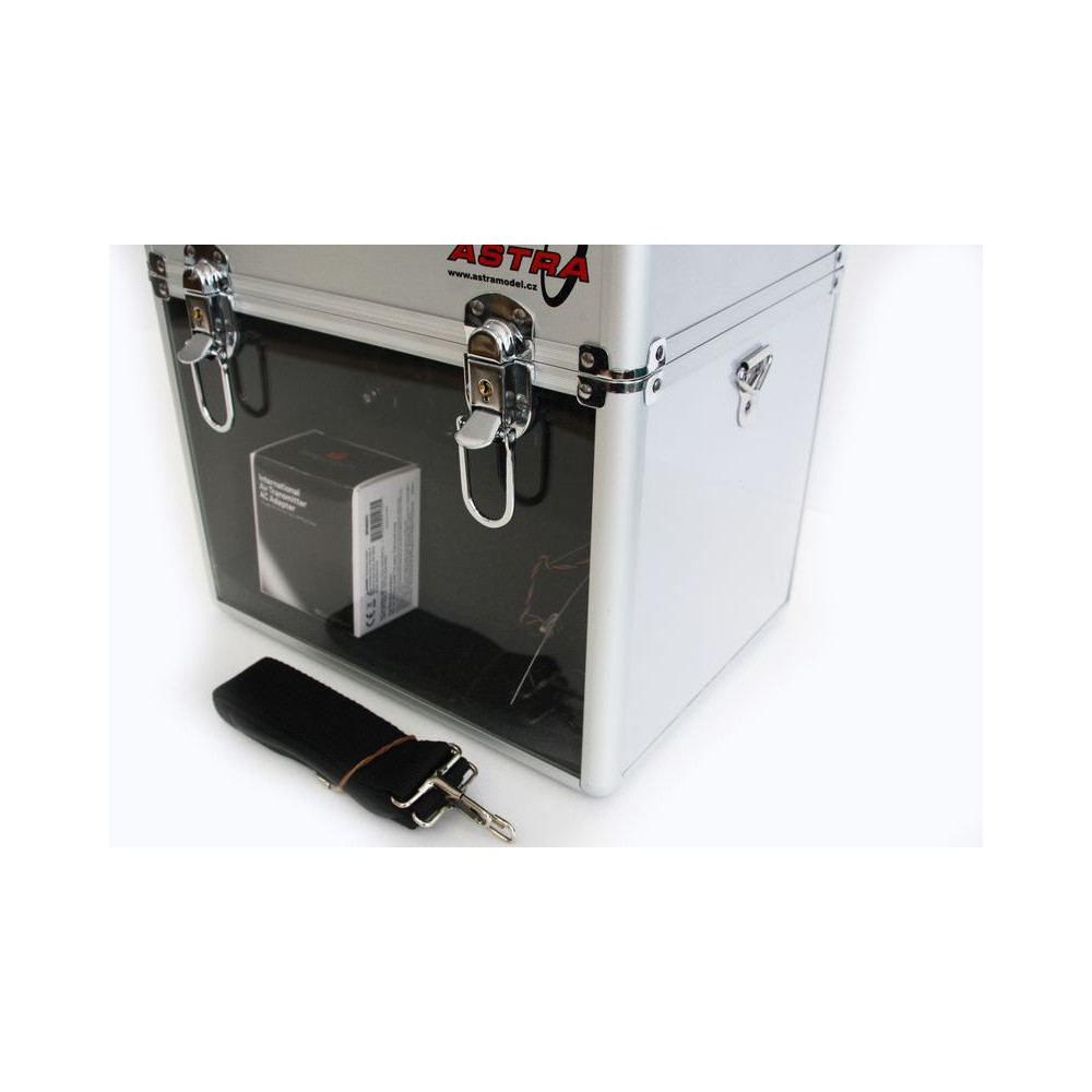 Alukoffer átlátszó fallal. Elővágott habszivacs az adó, töltő, akku és mikro-helikopter behelyezésére.
