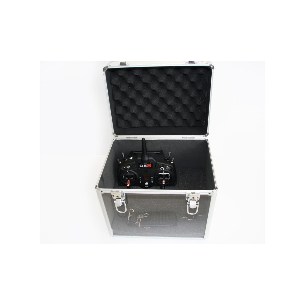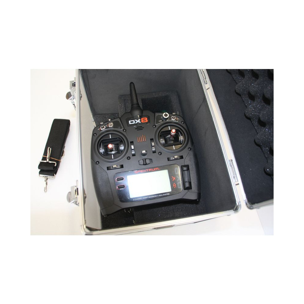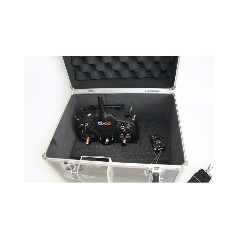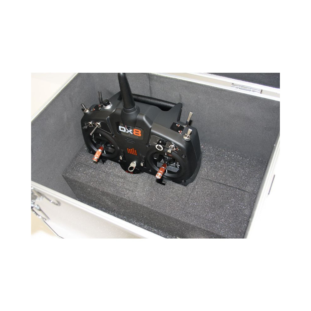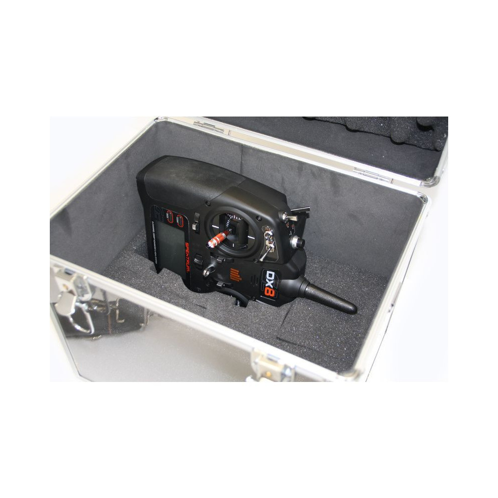 Alukoffer átlátszó fallal. Elővágott habszivacs az adó, töltő, akku és mikro-helikopter behelyezésére.