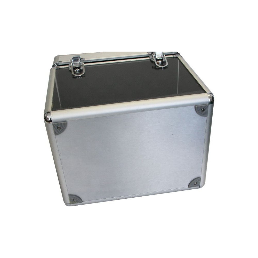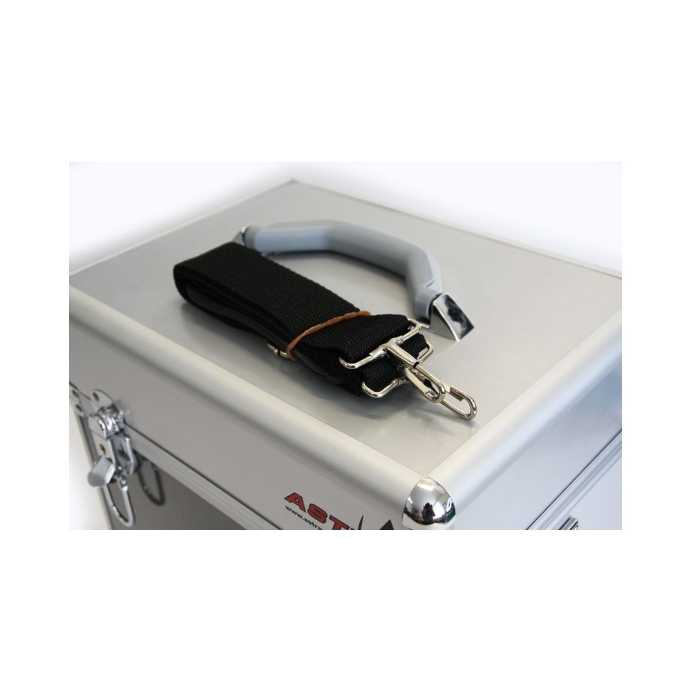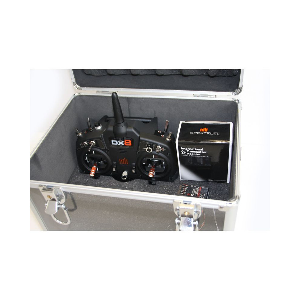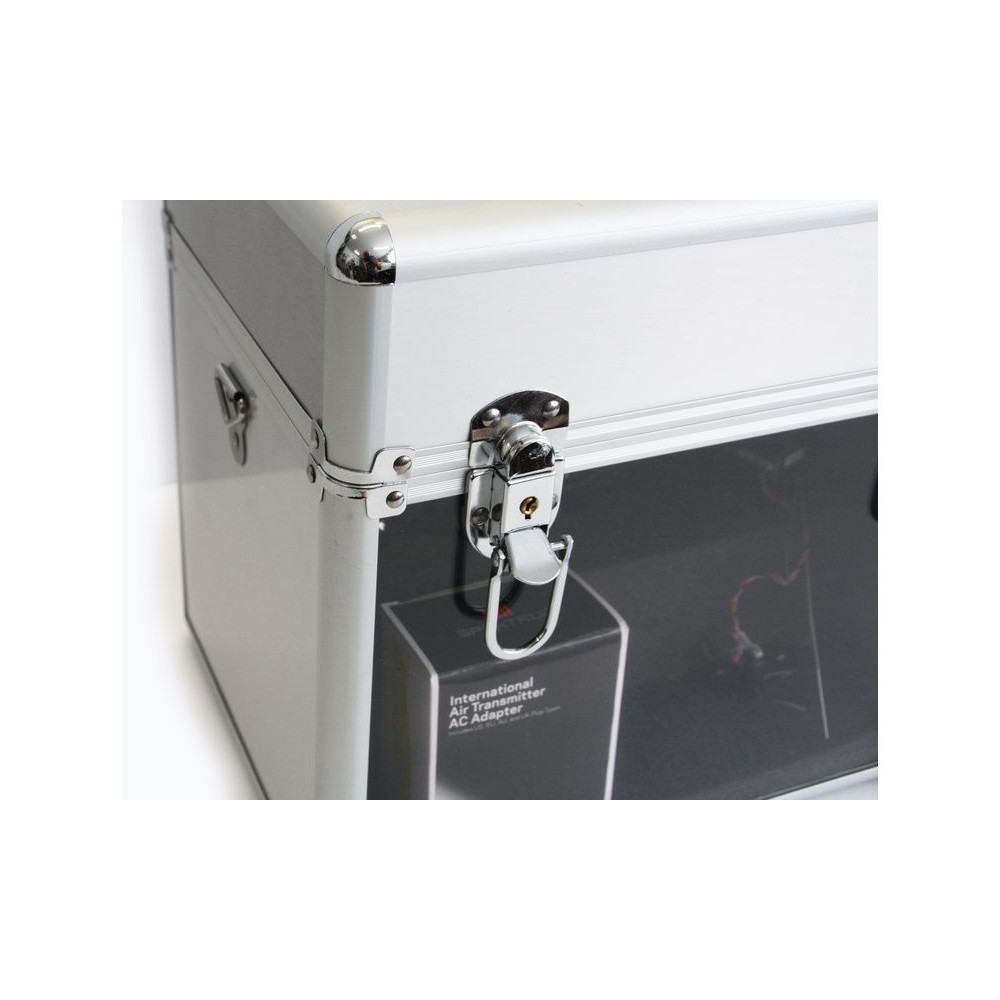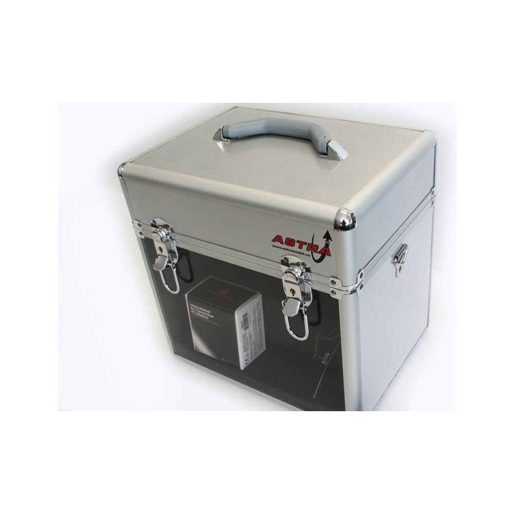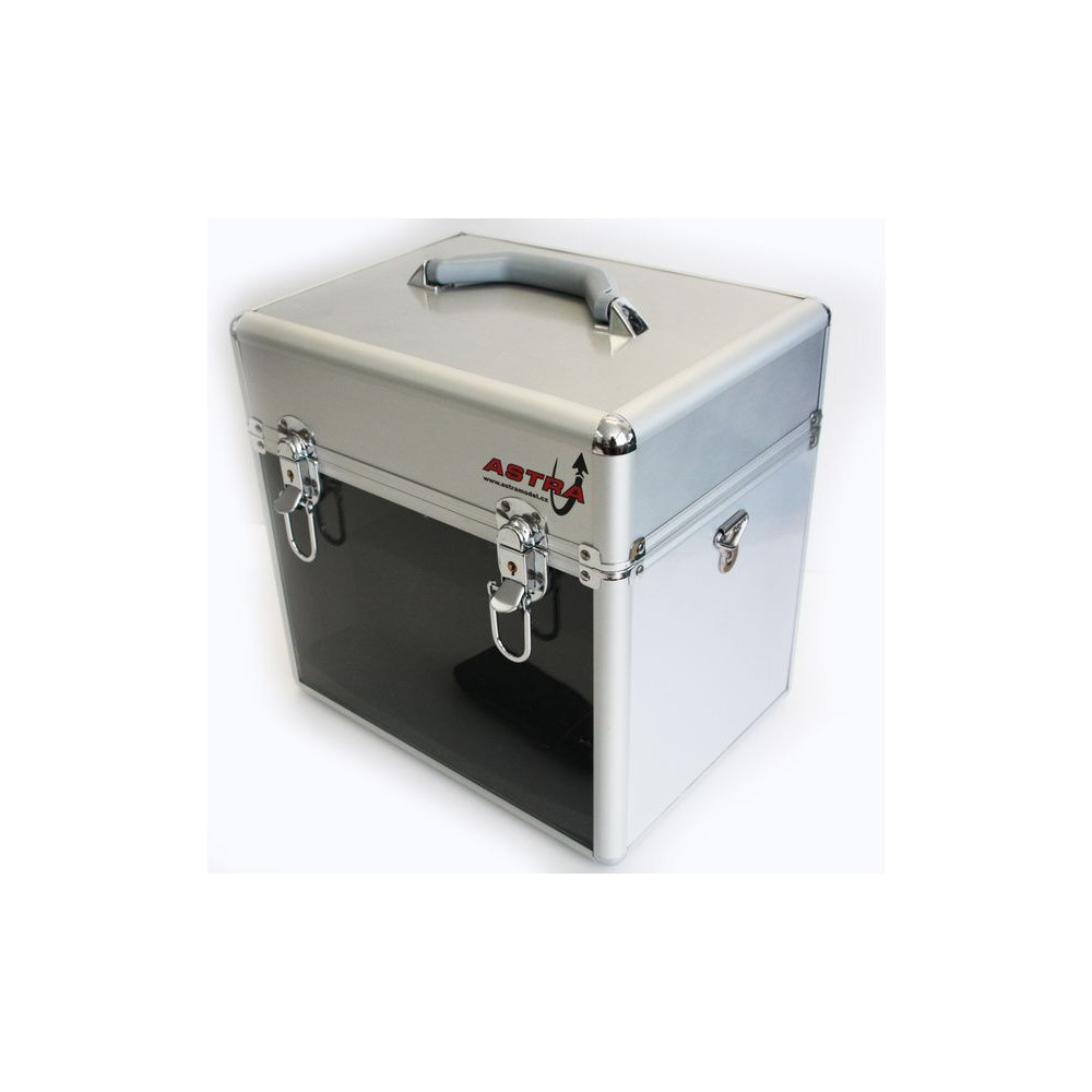 Alukoffer átlátszó fallal. Elővágott habszivacs az adó, töltő, akku és mikro-helikopter behelyezésére.