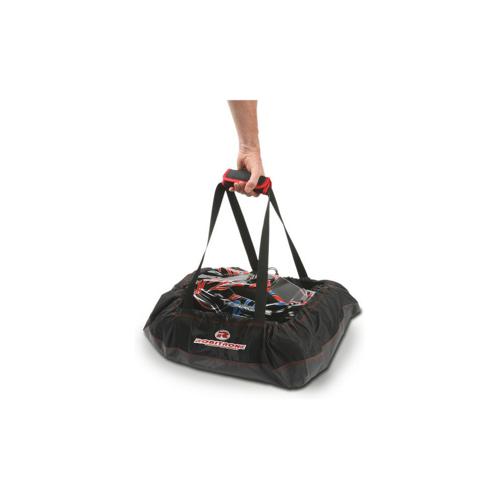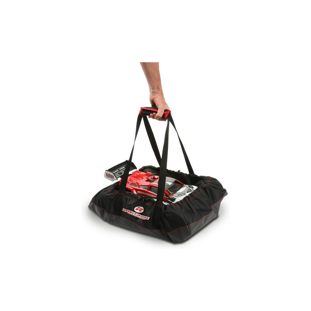 A Robitronic Truggy 1:8 autós táska mérete 44 x 57 x 16 cm, a szegély végén húzózsinórral. A fogantyú hossza kb. 30 cm. Szilárd varrott anyagból készült, erős fogantyúval. Tárolja a modellt a táskában az utazás után, és tartsa tisztán és szárazon az üléseket vagy a csomagtartót.