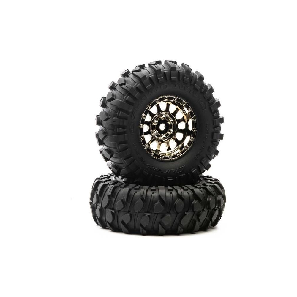 Komplett Duratrax 1,9" Class 1 Showdown CR C3 kerekek RC modellautókhoz. Tárcsaméret ⌀ 52x25 mm, teljes méret ⌀110x37 mm. A hordozó 12 mm-es hatszögletű, 12 mm-es eltolással. A tárcsa krómozott, a gumiabroncs keménysége C3 - lágy keverék.