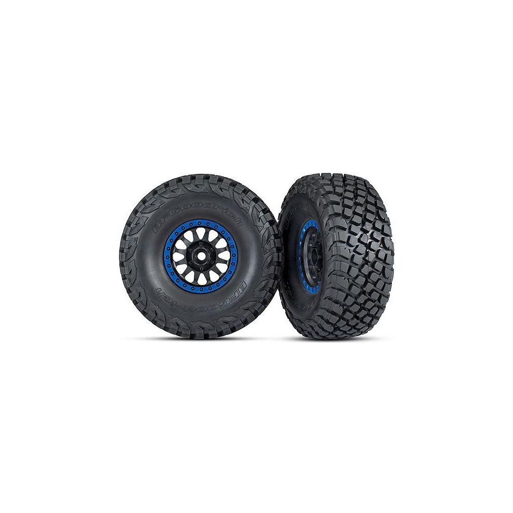 Teljes univerzális kerekek a Traxxas Unlimited Desert Racerhez. Method Racing kerekek fekete színben, kék felnikkel és Baja KR3 abroncsokkal (2 db a csomagban). 60/82x40 mm-es kerékméret. Teljes méret 135x56 mm. A hordozó 17 mm-es hatszögletű, hornyokkal és 25 mm-es eltolással.