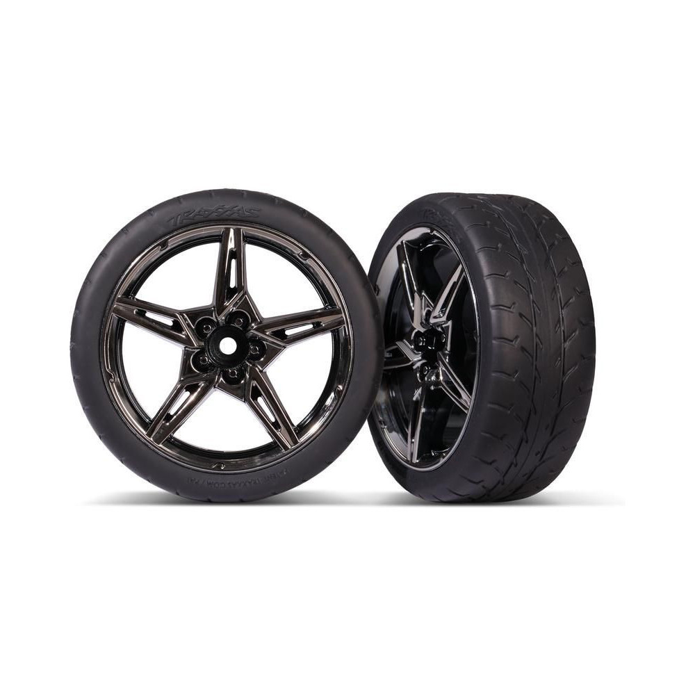 Traxxas kerék 1,9", fekete krómozott tárcsa, Response gumiabroncsok, 2 db csomagban, első tengelyhez - komplett kerekek felragasztott gumikkal. Kerékátmérő 75mm, szélesség 28mm, offset 15mm.