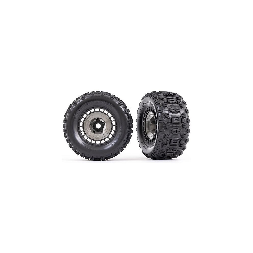 Traxxas kerék 3,8", Sledgehammer gumival, fekete tárcsa cserélhető szürke borítással. 2 db. Ezek a motocross ihletésű abroncsok extrém tapadást és irányíthatóságot biztosítanak. Különböző offset opciók a választható #9567 szettel. 17 mm-es hatszög - hornyos.