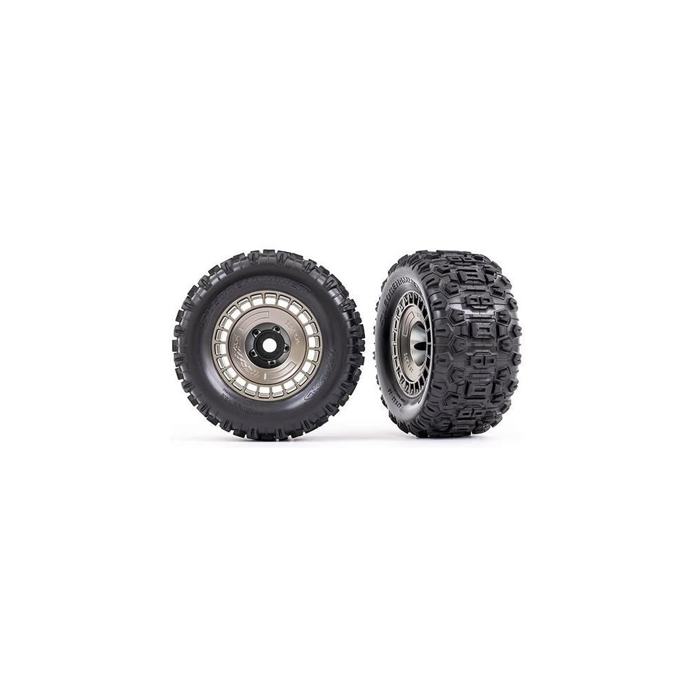 Traxxas kerék 3,8", Sledgehammer gumiabroncsok, fekete krómozott félmatt tárcsa cserélhető borítással. 2 db. Ezek a motocross ihletésű abroncsok extrém tapadást és irányíthatóságot biztosítanak. Különböző offset opciók a választható #9567-es szettel. 17 mm-es hatszögletű - hornyolt.