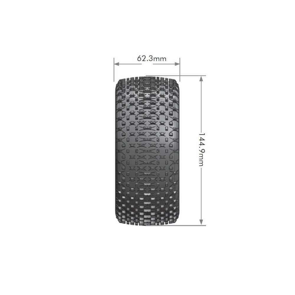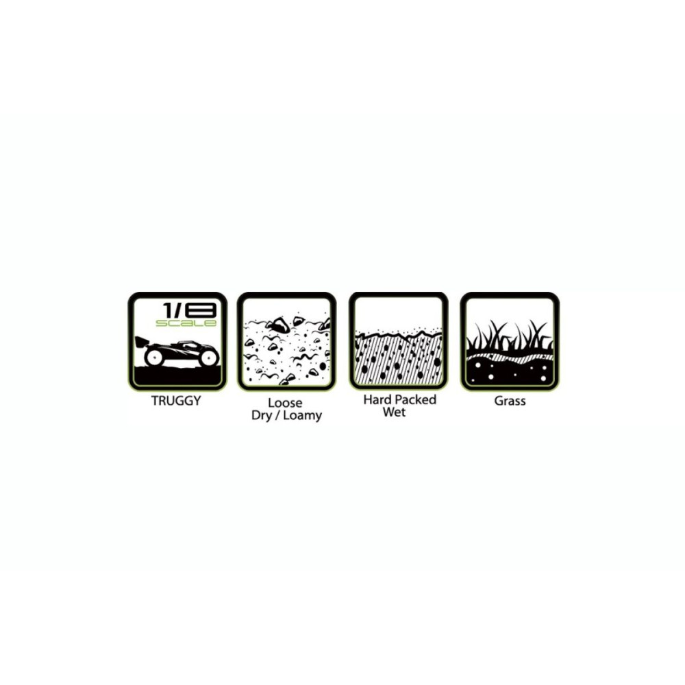 Komplett kerekek 1/8-as truggyhoz. Száraz, nedves, kemény, akár poros földes füves és hasonló felületekre alkalmas gumiabroncsok. Felnik 17 mm-es hex adapterhez.