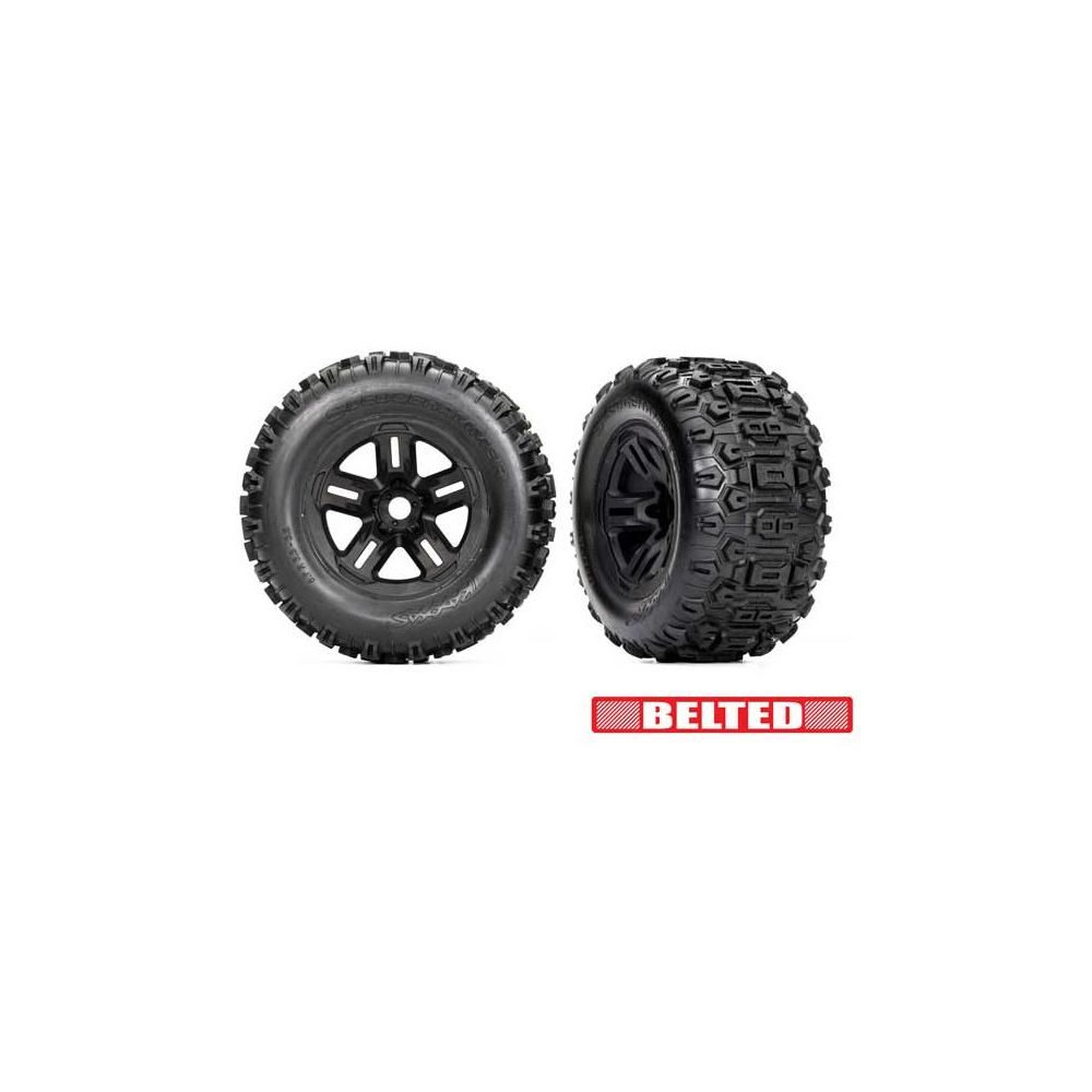 Traxxas kerék 3,8", fekete tárcsa, Sledgehammer öves gumiabroncsok. Széles futófelület nyitott blokkkal nem tömíti el a szennyeződés vagy törmelék, nagy tapadás a terepen. Az integrált belső öv csökkenti a kidudorodást nagy sebességnél. 17 mm-es barázdált hordozó. 2 db.