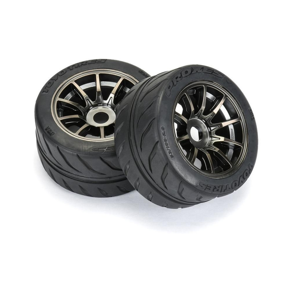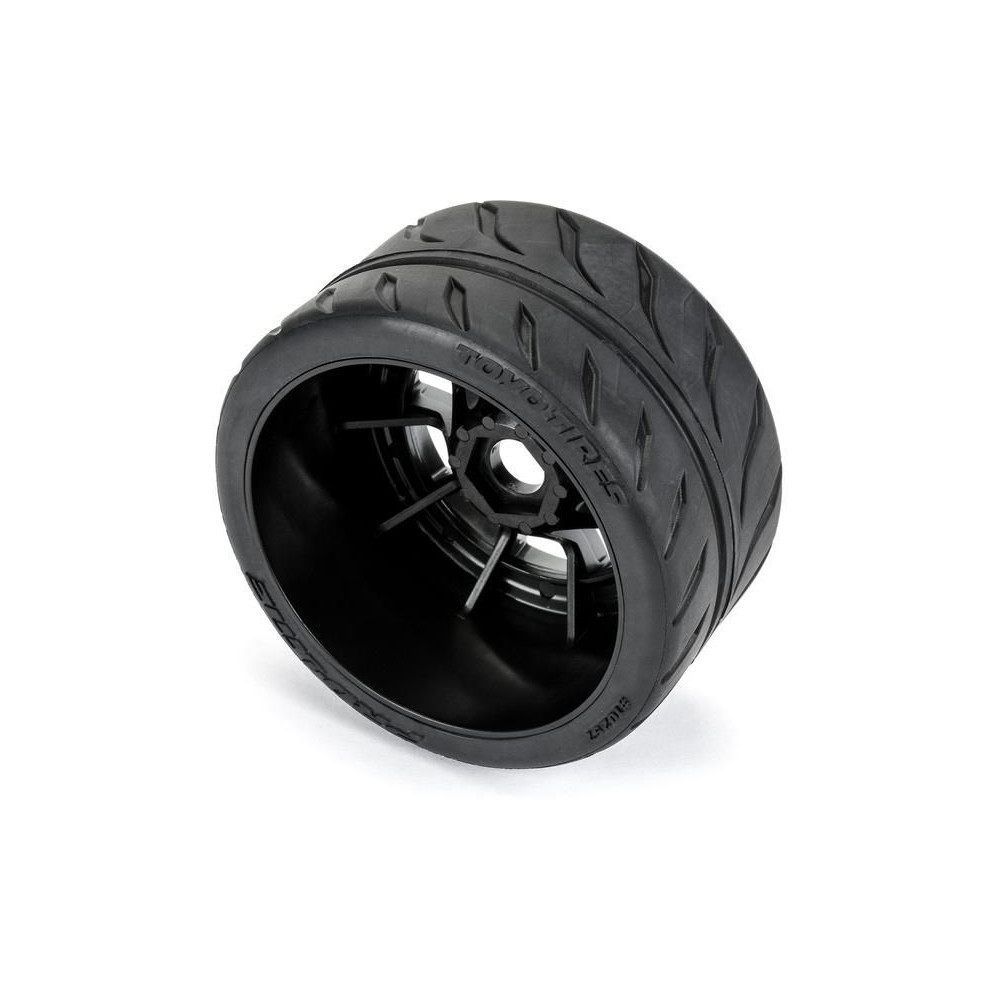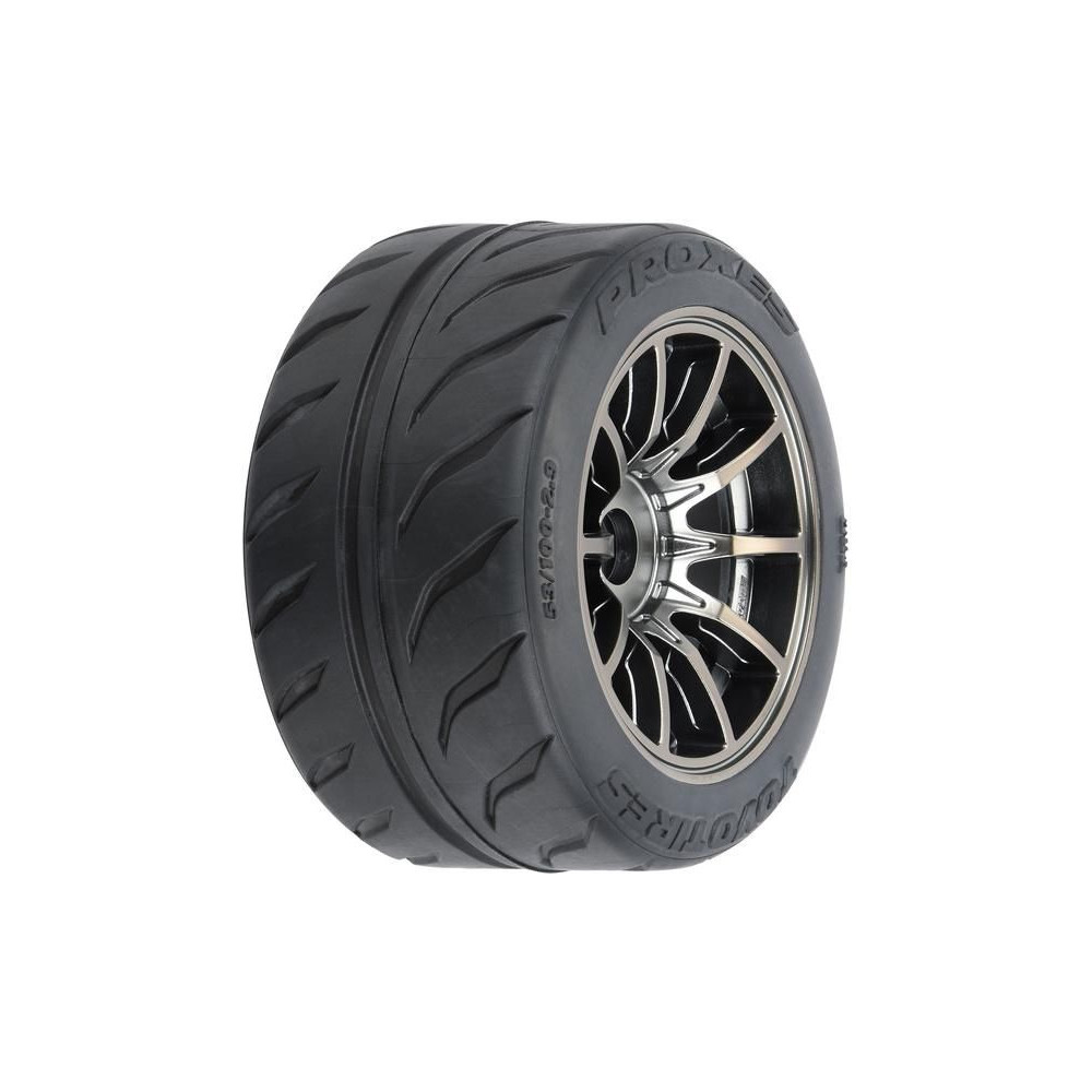Komplett Pro-Line kerekek RC autómodellekhez 1:7 arányban. Méretek ⌀100x53 mm. Korongkísértet sugarakkal. Gumiabroncsok Toyo Proxes R888R, övvel és integrált övvel, S3-as keménységű keverék (lágy). A meghajtó egy 17 mm-es hatszögletű. Zárt cellás betét.