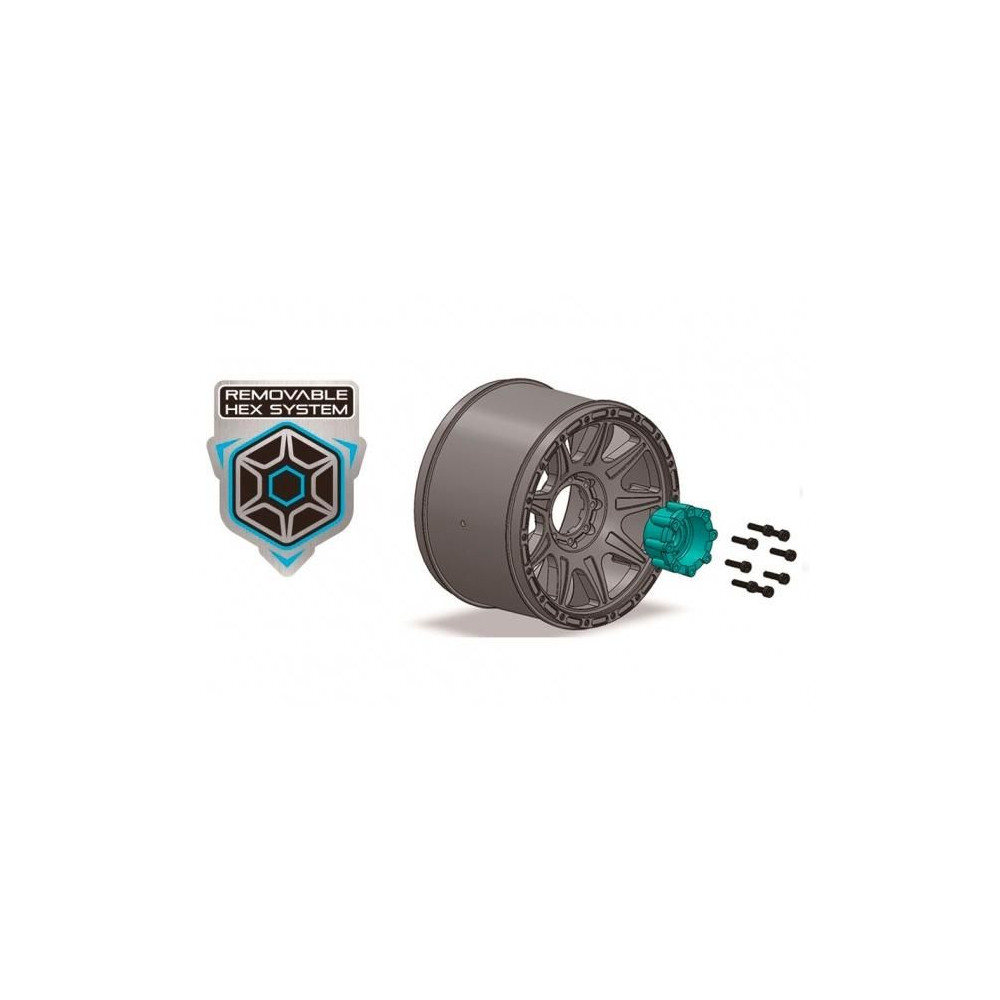 A levehető hatszögletű rendszer egy új funkció, amely lehetővé teszi, hogy különböző középpontok közül válassz, amelyekkel a kerekeket rögzítheted az RC autódhoz. Ezek a csomag részét képezik, és a mellékelt csavarok segítségével könnyen fel- és levehetők.