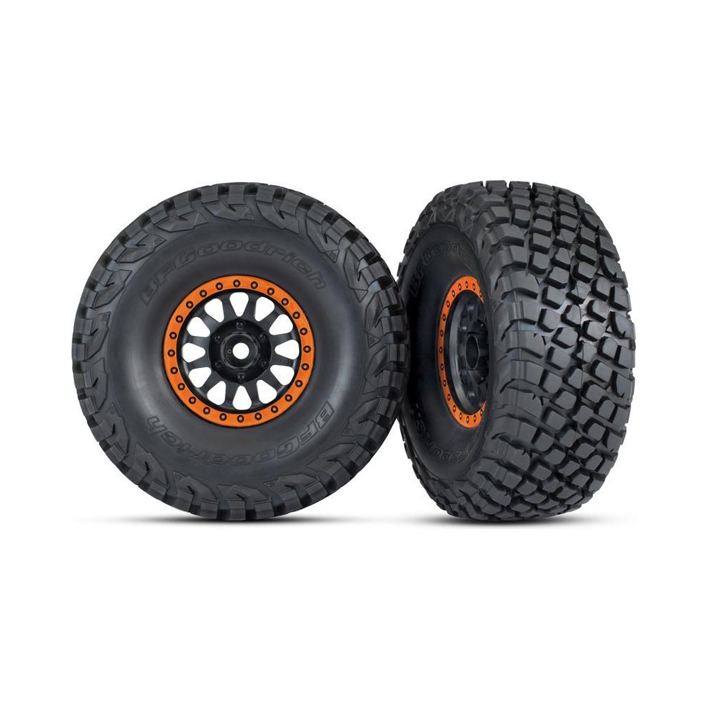 Komplett univerzális kerekek Traxxas Unlimited Desert Racerhez. Method Racing kerekek fekete kivitelben, narancssárga felnikkel és Baja KR3 gumiabroncsokkal (2 db egy csomagban).